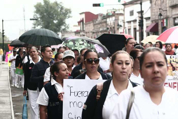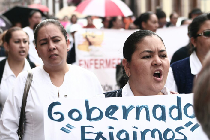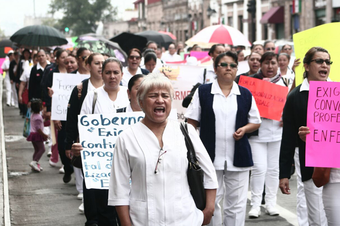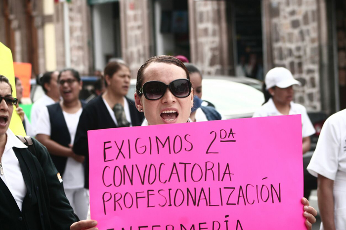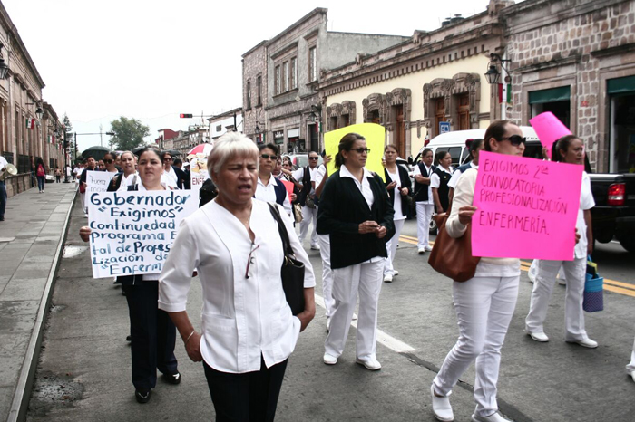 Redacción/La Voz de Michoacán Morelia, Michoacán. Enfermeras de hospitales de Michoacán marcharon este martes, en defensa de la profesionalización y el rechazo a las políticas de promoción laboral emprendidas por la Secretaría de Salud de Michoacán. La marcha salió de la plaza Villalongín sobre avenida Madero Oriente y llegó a Palacio de Gobierno, donde realizó un mitin.