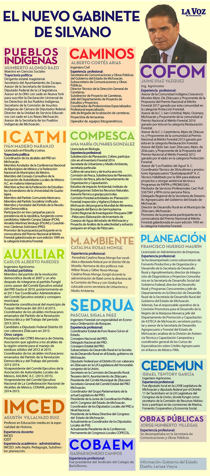 Héctor Tapia/La Voz de Michoacán Morelia, Michoacán. Luego de especulaciones y expectativas de la clase política, este lunes se realizan nuevos cambios en el gabinete de la administración estatal de Silvano Aureoles Conejo, gobernador de Michoacán. Aureoles dio a conocer 13 cambios en su gabinete de gobierno. Aquí el mandatario hizo un llamado a quienes se integran a que se dediquen "a las tareas que tenemos por delante, todo el esfuerzo debe estar enfocado a atender las tareas". En este contexto dijo que "es momento de crear nuevas rutas, de construir alianzas con los ciudadanos, para que seamos un gobierno cercano". Aureoles Conejo refirió que en Michoacán "tenemos desafíos por delante que debemos afrontar con unidad para llevar al estado a mejores niveles de desarrollo". Listas de cambios: SEDRUA – PASCUAL SIGALA COMPESCA – ANA MARIA OLIVARES COFOM – JAIME DÍAZ VÁZQUEZ JUNTA DE CAMINOS- ALBERTO CORTÉS ICATMI – IVÁN MADERO IMCED – AGUSTIN VILLALBAZO COMISIÓN ESTATAL PARA EL DESARROLLO DE LOS PUEBLOS INDÍGENAS – HUMBERTO ALONSO RAZO INSTITUTO DE PLANEACIóN – FRANCISCO HUERGO MAURÍN CEDEMUN – ISRAEL TENTORI SUBSECRETARIO DE COMUNICACIONES Y OBRAS PÚBLICAS – JORGE VILLEGAS GARCÍA SUBSECRETARIA DEL MEDIO AMBIENTE – CATALINA ROSAS MONGE SECRETARIA AUXILIAR DEL GOBERNADOR – CARLOS PAREDES COBAEM- GASPAR MORENO.