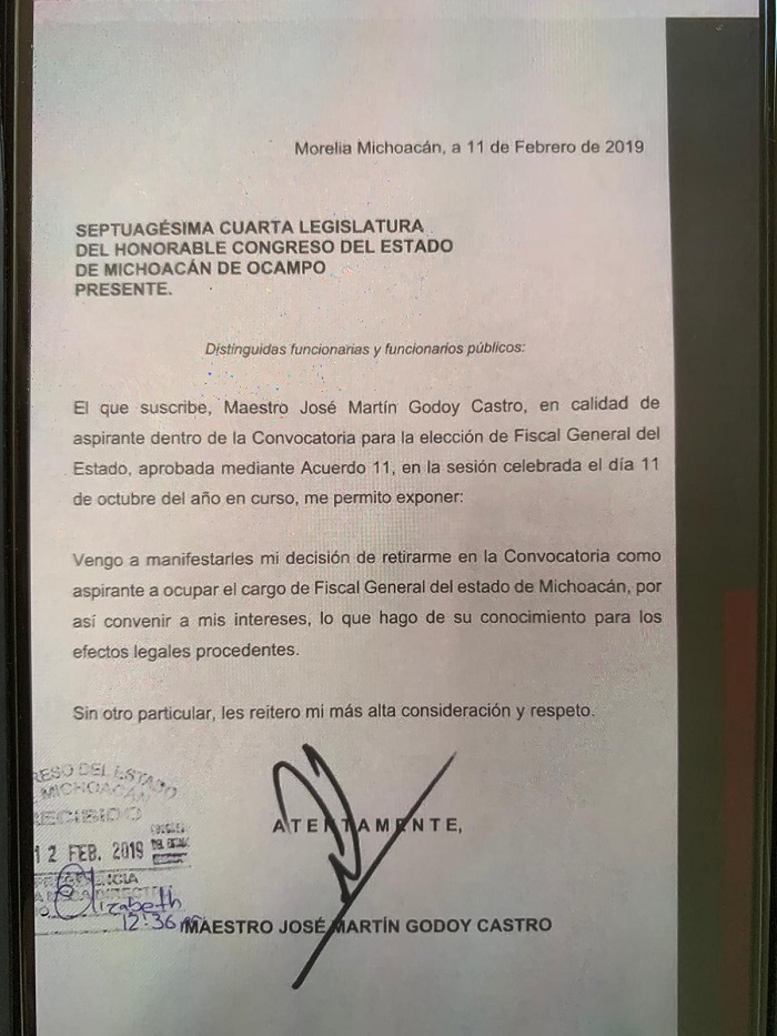 "Vengo a manifestarles mi decisión de retirarme en la Convocatoria como aspirante a ocupar el cargo de Fiscal General del Estado de Michoacán, por así convenir a mis intereses, lo que hago de su conocimiento para los efectos legales procedentes. Sin otro particular les reitero mi más alta consideración y respeto".