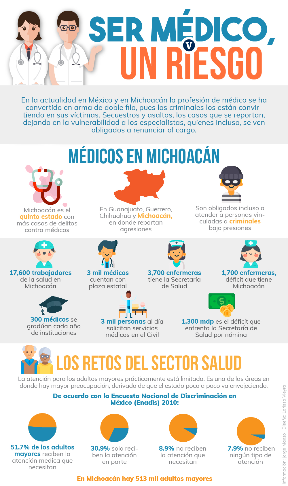 Jorge Manzo/La Voz de Michoacán Morelia, Michoacán. Cada 23 de octubre se celebra en México el Día del Médico, que fue constituido para reconocer la labor que desempeñan cada día, de tal manera que se estableció como homenaje al doctor Valentín Gómez Farías, quien inauguró el establecimiento de Ciencias Médicas en la Ciudad de México. Pero en Michoacán la celebración se torna complejo, luego de que es una de las cinco entidades en donde la labor representa una actividad de riesgo. Aunque no se tiene registros oficiales, se han reportado incidentes que van desde secuestros exprés hasta asaltos a los galenos. No obstante, sigue siendo una de las profesiones más reconocidas y queridas por las mayorías. Infografía: Larissa Vieyra.