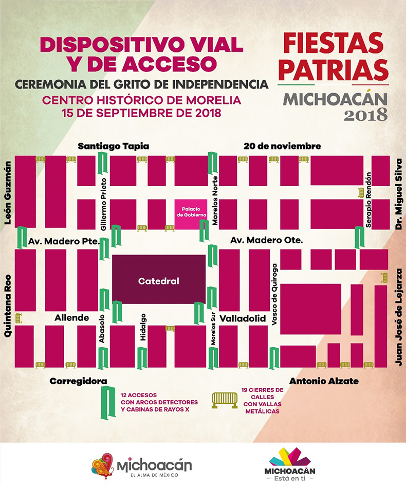 Redacción / La Voz de Michoacán Morelia, Michoacán. La entidad se encuentra listo para honrar a sus héroes patrios en las tradicionales fiestas del 15 y 16 de septiembre, en el marco del 208 Aniversario de la Independencia de México. Para la rememoración del Grito de Independencia y la realización del Desfile Cívico-Militar en la capital michoacana, en el que tomarán parte más de 4 mil 50 alumnos, alumnas y docentes de los distintos niveles educativos, se tiene previsto un amplio operativo interinstitucional para garantizar que los festejos se desarrollen en un ambiente familiar y de armonía. Con la instalación del Centro de Mando Fiestas Patrias 2018, que presidió el Gobernador del Estado, Silvano Aureoles Conejo, el pasado jueves, se coordina el esfuerzo de elementos de instancias de seguridad y justicia de los tres órdenes de gobierno, como son la Policía Michoacán, la Policía Municipal de Morelia, Policía Auxiliar, Procuraduría General de Justicia en el Estado, Gendarmería, Policía Federal División Caminos y otras instancias locales. A partir del 14 de septiembre por la noche, iniciarán cortes viales y retiro de unidades vehiculares en las zonas de anillos de seguridad y puntos estratégicos para mantener la vigilancia en espacios como las plazas de Armas y Melchor Ocampo; en tanto que, en la madrugada del 15, se llevará a cabo la instalación de arcos detectores y vallas metálicas para trazar el diámetro de atención y vigilancia. Serán en total 12 accesos con arcos detectores de metales y 19 cierres de calles con vallas metálicas, desde la Calzada La Huerta hasta Ventura Puente, cubriendo además alrededor de 40 manzanas del Centro Histórico, sitio de los principales festejos. Como parte de las actividades que se realizarán el día 15, previo a la ceremonia del Grito de Independencia, el Gobierno del Estado ofrecerá un atractivo programa artístico-cultural para disfrutar en familia, que se desarrollará sobre la avenida Francisco I. Madero, en el Centro Histórico de Morelia. Con entrada libre y gratuita, la presentación estelar de la Ciclónica Sonora Dinamita y del cantante Lupillo Rivera, serán el broche de oro del festejo. Los asistentes únicamente deberán atender las indicaciones logísticas y de seguridad que acompañarán a esta tradicional verbena de música y color. La tradicional fiesta michoacana iniciará al filo de las 18:30 horas, con la actuación del reconocido grupo musical Bola Soriana y lo mejor de su repertorio en música tradicional y canto nuevo, típico de México y América Latina; seguidos de la presentación de cuatro ballets en el marco del Noveno Festival Internacional de Danza Folklórica, “J. Roberto García Marín”, representando a México, Argentina, Chile y Perú. Para el día 16 de septiembre se tiene programado el Desfile Cívico Militar con un nutrido contingente académico integrado principalmente por estudiantes y docentes. De nivel básico, se calcula una asistencia de mil 188 participantes, entre escolares y docentes de 5 escuelas secundarias tecnológicas y 4 secundarias federales. De nivel medio superior, tomarán parte mil 311 alumnos, alumnas y docentes de 9 instituciones académicas y de nivel superior, mil 561 maestros, maestras y estudiantes de 8 escuelas e institutos. Con este amplio programa de actividades cívico-culturales y artísticas, los michoacanos y michoacanas revivimos la historia para fortalecer valores y mantener vigente el legado de quienes dieron la vida por nuestra libertad e independencia.