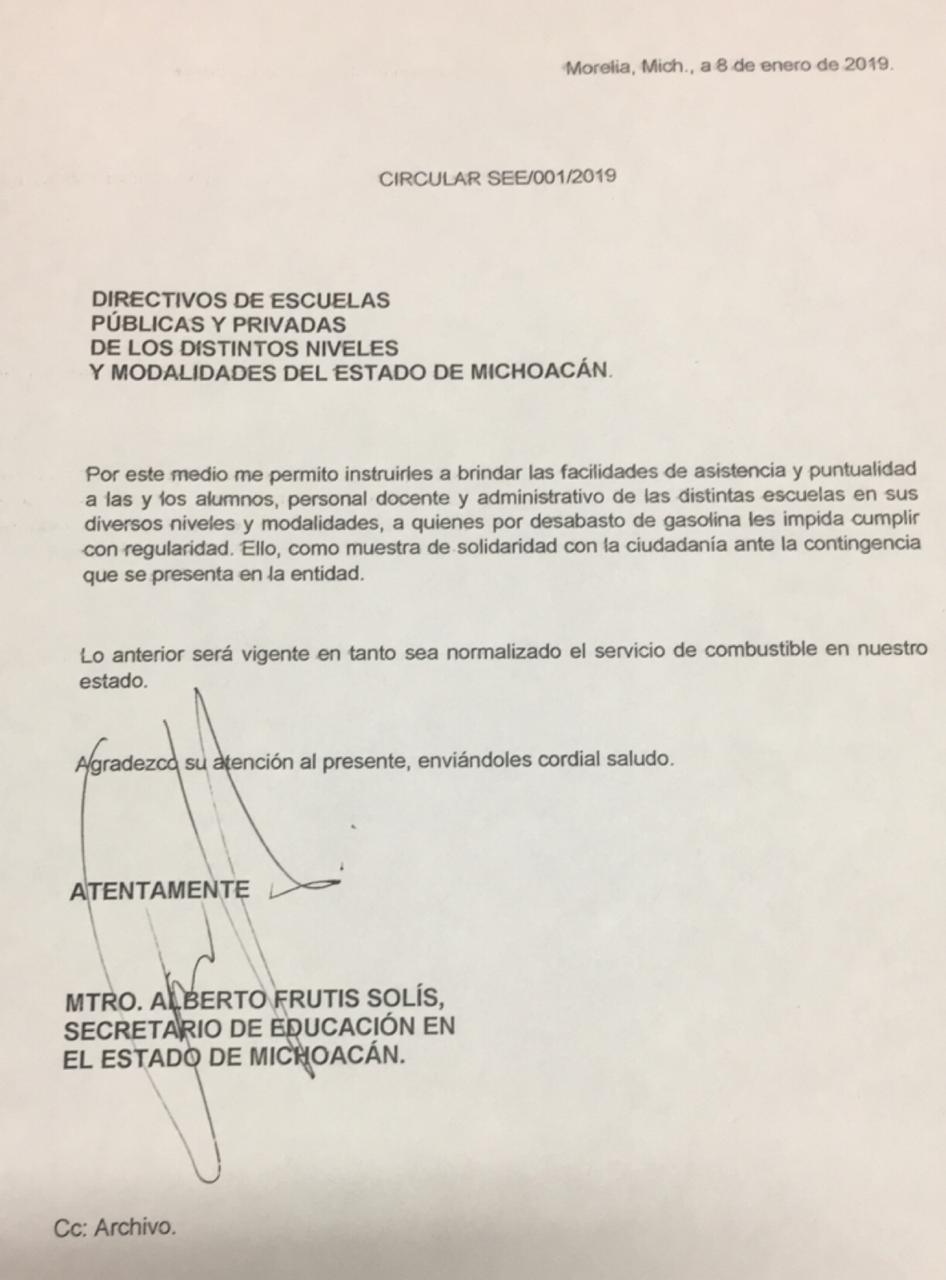 Fabian Alanis/La Voz de Michoacán Morelia, Michoacán. A través de un comunicado el titular de la Secretarìa de Educación en el Estado (SEE), Alberto Frutis Solís, dio a conocer que no habrá sanciones para niños que falten a clases por el desabasto de gasolina que enfrenta la capital michoacana. "Por este medio me permito instruirles a brindar las facilidades de asistencia y puntualidad a las y los alumnos, personal docente y administrativo de las escuelas en sus diferentes niveles, a quienes por el desabasto de gasolina les impida cumplir sus actividades, expresa en el comunicado Frutis Solís. En cuanto al problema de desabasto, empresarios comentan que no hay gasolina y no se tiene una fecha para que se restablezca el servicio, toda vez que las terminales que abastecen a Michoacán no cuentan con combustibles en sus almacenes.