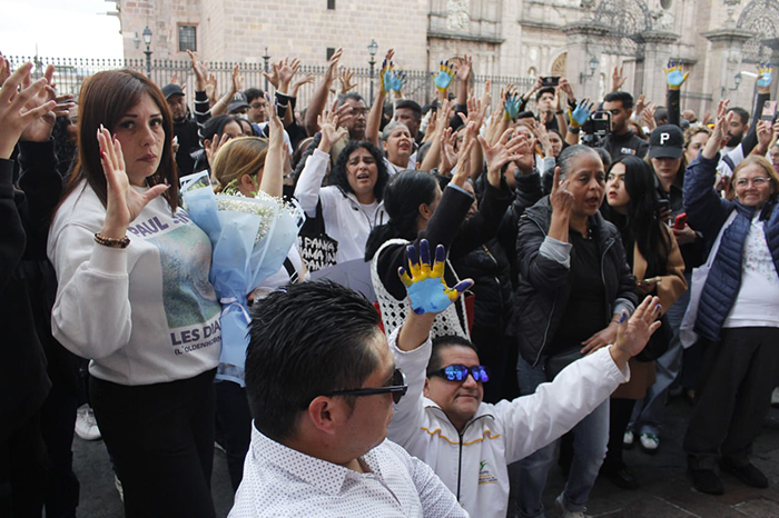 Morelia, Michoacán. - Desde las 17:00 horas de este martes, familiares de la familia Mújica Hernández, integrantes de la comunidad sorda, intérpretes de Lengua de Señas Mexicana (LSM) y ciudadanía en general se concentró frente al Palacio de Gobierno para exigir memoria, verdad y justicia por Víctor, Anayeli y la menor Megan, asesinados recientemente.
