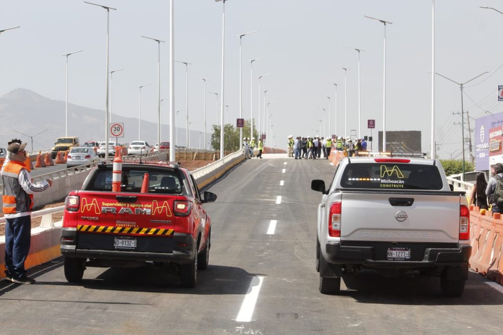 Christian Hernández / La Voz de Michoacán Morelia, Michoacán. Finalmente fueron abiertos los tres carriles del puente norte del Distribuidor Paso Eréndira, lo que promete dar flujo vehicular en la zona del Mercado de Abastos y la salida a Charo. A las 14:30 horas del este jueves, el gobernador Alfredo Ramírez Bedolla y el secretario de Comunicaciones y Obras Públicas, Rogelio Zarazúa, encabezaron la apertura ante medios de comunicación de la parte alta de la obra. El gobernador dijo que la constructora sigue trabajando “arduamente para terminar el parque lineal interior y habilitar 4 carriles más en la parte inferior”, con lo que próximamente serán 10 carriles en total. Zarazúa recordó que el libramiento en esta altura de la ciudad, contaba con 6 carriles y que ahora esa cantidad se mantiene, pero en la parte superior, “3 carriles en cada uno de los puentes”, pero que en la parte baja se adecuarán otros 4. Foto: Samuel Herrera Jr., La Voz de Michoacán. “El puente norte mide casi 500 metros de longitud y en total entonces son 6 carriles superiores los que tendrá y que a partir de hoy vamos a apertura, es una estructura que es en acero, son como 1700 toneladas de acero estructural, lleva también 25 centímetros de concreto reforzado con fibra, aisladores sísmicos y puntas de dilatación”, explicó el secretario. Respecto a la cantidad de vehículos que se beneficiarán, el funcionario dijo que son 80 mil que circulan todos los días por este punto, “pero si contamos los que entran salen a la zona del Mercado de Abastos y las colonias son los que van a hacer uso del mismo, son más de 150 mil vehículos al día los que transitan en este punto, entonces seguramente a partir de hoy notaremos una mejoría muy relevante en todo el tránsito en esta zona, sobre todo en horas pico como la que estamos ahorita”. Consideró que abrir los nuevos carriles superiores permitirá a los trabajadores intensificar trabajos en la parte inferior: “ya empezamos todo el bajopuente, como es estructura metálica logramos unos grandes, claro se hicieron como 6 mil 700 metros cuadrados de todo lo que vamos a hacer, hay un parque, un espacio público, es más de lo que mide la Plaza de Armas”. Foto: Samuel Herrera Jr., La Voz de Michoacán. El bajopuente contará con un skatepark, juegos infantiles, inmobiliario urbano, área para mascotas y cruces seguros con banquetas también, para esta entrega se tienen contemplado 60 días. Sobre la inversión, dijo que fueron 440 millones de pesos la que se está ejerciendo en este punto y que es una obra multianual, quiere decir que se contrató en su momento congelando el tema de precios de acero, de concreto y otros materiales. Foto: Samuel Herrera Jr., La Voz de Michoacán.