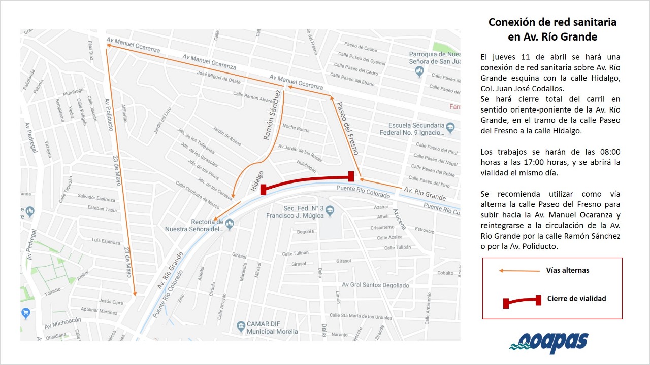 Morelia, Michoacán. El Organismo Operador de Agua Potable Alcantarillado y Saneamiento de Morelia (OOAPAS) informó que este jueves 11 de abril se lleva a cabo la obra del cruce de red sanitaria ubicada sobre la Av. Río Grande en la esquina con la calle Hidalgo, a la altura de la colonia Juan José Codallos.