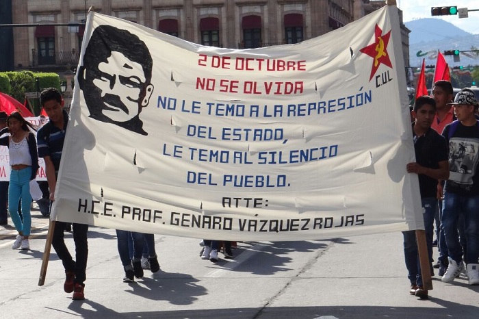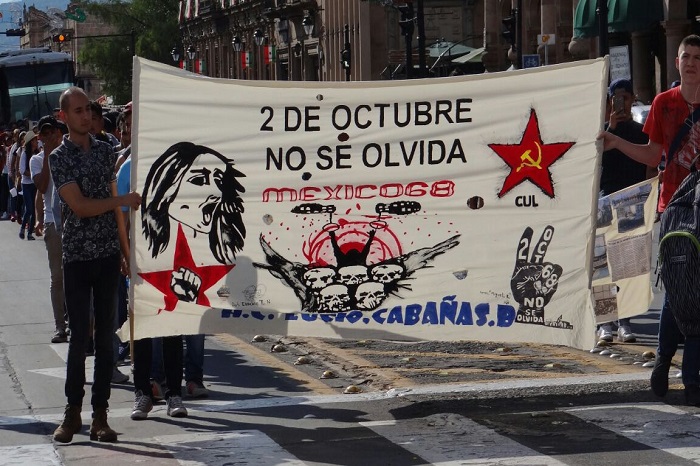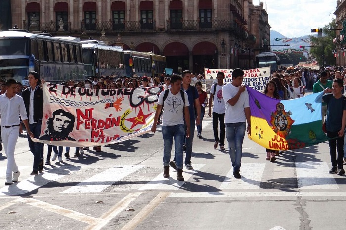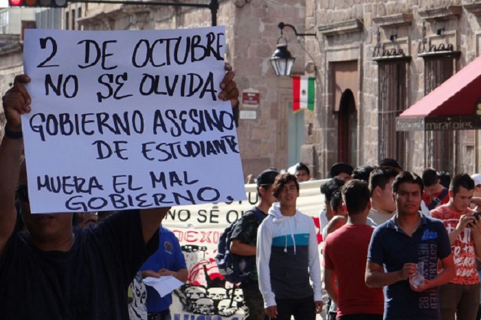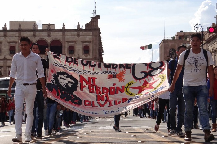 Morelia, Michoacán. La movilización para conmemorar el 2 de octubre de 1968 cuando ocurrió la matanza estudiantil en la Ciudad de México partió desde Ciudad Universitaria avances sobre Cuautla y ya arribó al centro histórico donde realizarán un mitin y un acto cultural.