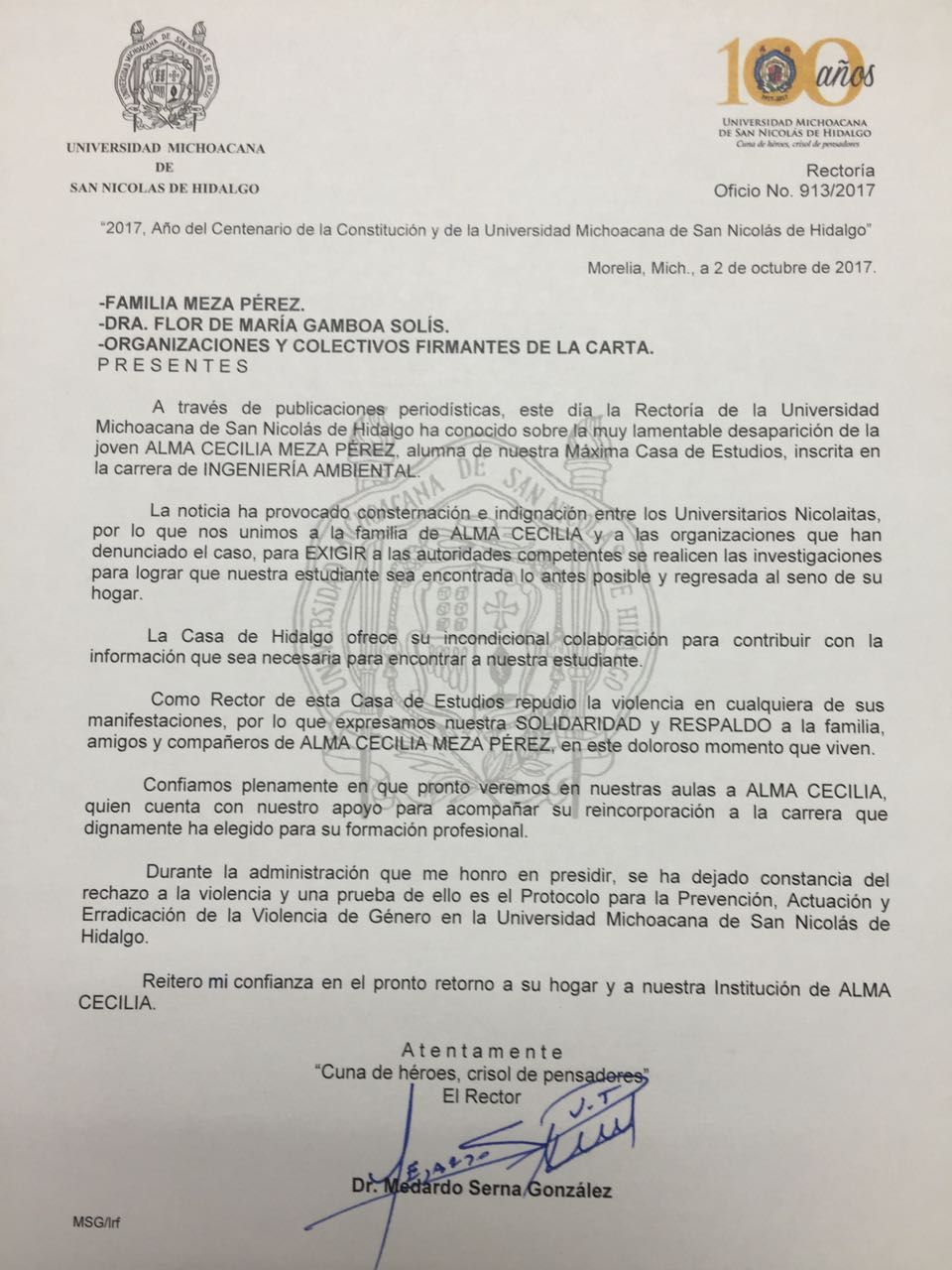 Redaccción Web/ La Voz de Michoacán Morelia, Michoacán. Luego de las declaraciones dadas ha conocer por la familia de Alma Cecilia por su desaparición, Medardo Serna ya dio su postura al respecto. El rector de la Universidad Michoacana de San Nicolás de Hidalgo (UMSNH), Medardo Serna señaló a través de un comunicado que se unen a la exigencia de la familia y comunidad estudiantil de encontrar pronto a la alumna de la facultad de ingeniería. Alma Cecilia desapareció el 14 de septiembre, sin que hasta el momento se sepa noticia sobre su paradero. A continuación te dejamos el comunicado que emitió el rector de la UMSNH.
