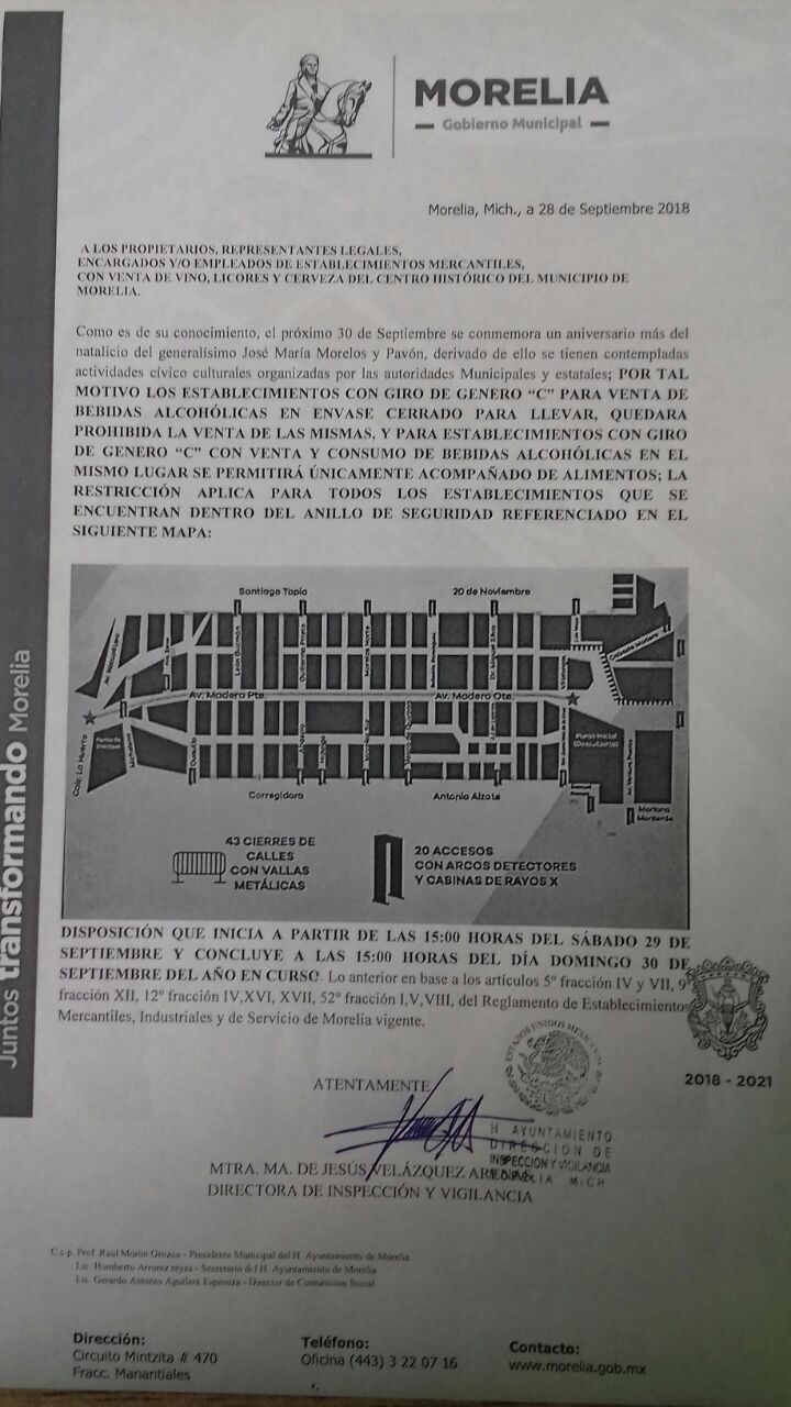 Morelia, Michoacán. El Ayuntamiento de Morelia ha dado a conocer que habrá restricción de venta de bebidas alcohólicas en el centro histórico el próximo 30 de septiembre con motivo del festejo del natalicio de Morelos.