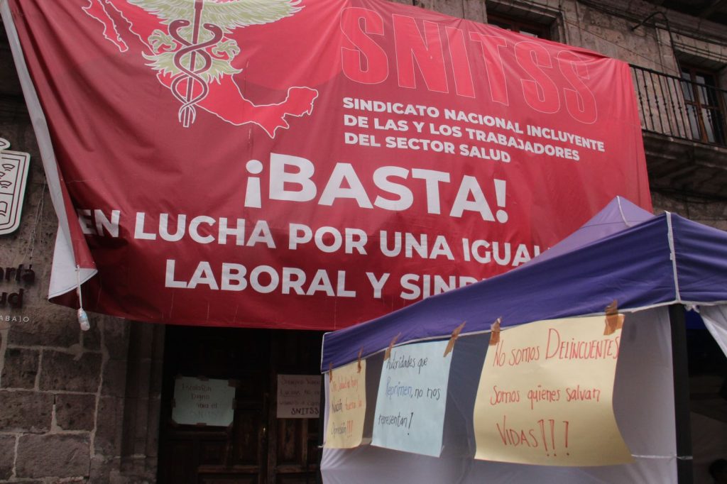 Fachada de las oficinas de la Secretaría de Salud de Michoacán con pancartas de manifestantes