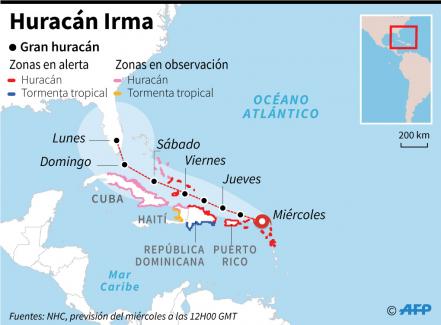 Puerto Rico. El huracán de categoría 5 Irma, el más fuerte registrado nunca en el Atlántico, no cede un ápice su fuerza y mantiene hoy sus vientos de 295 kilómetros por hora mientras se acerca a la costa norte de Puerto Rico en su avance hacia República Dominicana, Cuba, Bahamas y el sur de Florida.