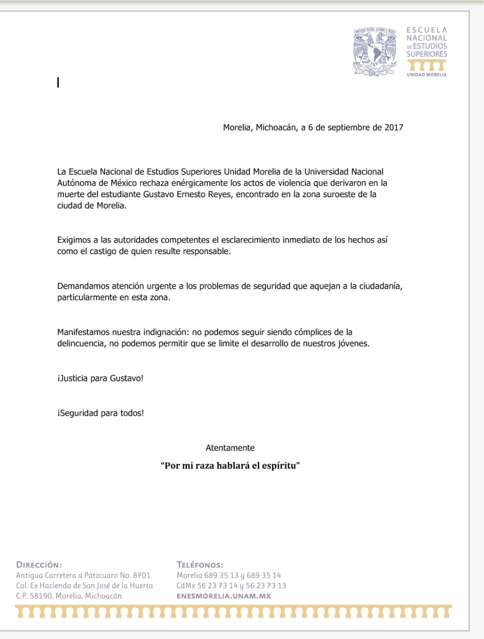 Tere Jaramillo/ La Voz de Michoacán Morelia, Michoacán. La Escuela Nacional de Estudios Superiores Unidad Morelia de la Universidad Nacional Autónoma de México rechazó enérgicamente, a través de un comunicado, la muerte del estudiante Gustavo Ernesto Reyes. Asimismo exigieron el esclarecimiento y se dé castigo con los responsables. También demandaron atención urgente a los problemas de seguridad, en especial de esta zona.