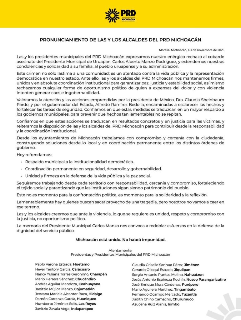 Redacción / La Voz de Michoacán Morelia, Michoacán. Alcaldesas y presidentes municipales del PRD en Michoacán se pronunciaron en contra del oportunismo político de quien, a expensas del dolor y con violencia, intenta generar caos e ingobernabilidad. A través de una carta firmada por 19 presidentas y ediles del sol azteca manifestaron que no es momento para la confrontación política, sino de la solidaridad y la reflexión; asimismo, lamentaron que hay quienes buscan sacar provecho de una tragedia. “Nosotros no vamos a caer en ese terreno”, coincidieron. Por el contrario, sostuvieron que, ante la violencia, lo que se requiere es unidad, respeto y compromiso con la justicia, no oportunismo político. “La memoria del Presidente Municipal Carlos Manzo nos convoca a redoblar esfuerzos en la defensa de la dignidad del servicio público. Michoacán está unido. No habrá impunidad”, afirmaron. Asumieron el compromiso de trabajar cada uno desde su territorio con responsabilidad, cercanía y compromiso, fortaleciendo el tejido social y garantizando que las instituciones sigan siendo patrimonio del pueblo. Lanzaron un enérgico rechazo al cobarde asesinato del alcalde de Uruapan y extendemos sus condolencias y solidaridad a su familia, al pueblo uruapense y a su administración. “Este crimen no sólo lastima a una comunidad; es un atentado contra la vida pública y la representación democrática en nuestro estado. Ante ello, las y los alcaldes del PRD Michoacán nos mantenemos firmes, unidos y en absoluta coordinación institucional para garantizar paz, justicia y estabilidad social”, indicaron. Dijeron valoran la atención y las acciones emprendidas por la presidenta Claudia Sheinbaum Pardo y el gobernador de Michoacán, Alfredo Ramírez Bedolla, encaminadas a esclarecer los hechos y fortalecer las tareas de seguridad. “Confiamos en que estas medidas se traduzcan en un mayor respaldo a los gobiernos municipales, para prevenir que hechos tan lamentables no se repitan. (…) En que estas acciones se traduzcan en resultados concretos y en justicia para las víctimas, y reiteramos la disposición de las y los alcaldes del PRD Michoacán para contribuir desde la responsabilidad y la coordinación institucional”, agregaron. El documento lo firman las y los alcaldes de Huetamo, Carácuaro, Charapan, Chucándiro, Coahuayana, Cojumatlán, Hidalgo, Huaniqueo, Los Reyes, Indaparapeo, Jiménez, Jiquilpan, Nahuatzen, Nuevo Parangaricutiro, Purépero, Tingambato, Tuzantla, Churumuco e Irimbo.