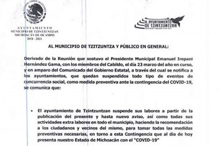Redacción / La Voz de Michoacán Morelia, Michoacán. Este lunes, el Cabildo de Tzintzuntzan determinó que, para hacer frente a la pandemia por COVID-19, el Ayuntamiento suspende labores hasta nuevo aviso. A través de un documento firmado por el alcalde, Emanuel Irepani Hernández Gama, así como la síndico María Soledad Arciga y siete regidores, el gobierno municipal informó que tomó tal determinación en amparo del comunicado de gobierno estatal, que suspende todo tipo de eventos de concurrencia social como medida preventiva ante la contingencia por el coronavirus. El Ayuntamiento hizo la recomendación a la población de tomar todas las medidas preventivas necesarias.