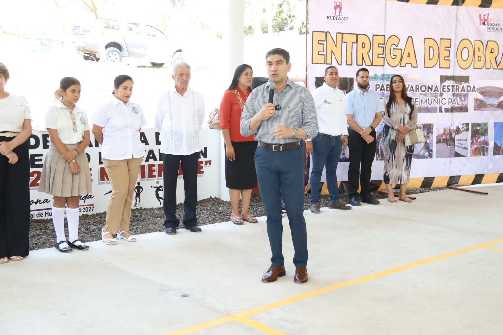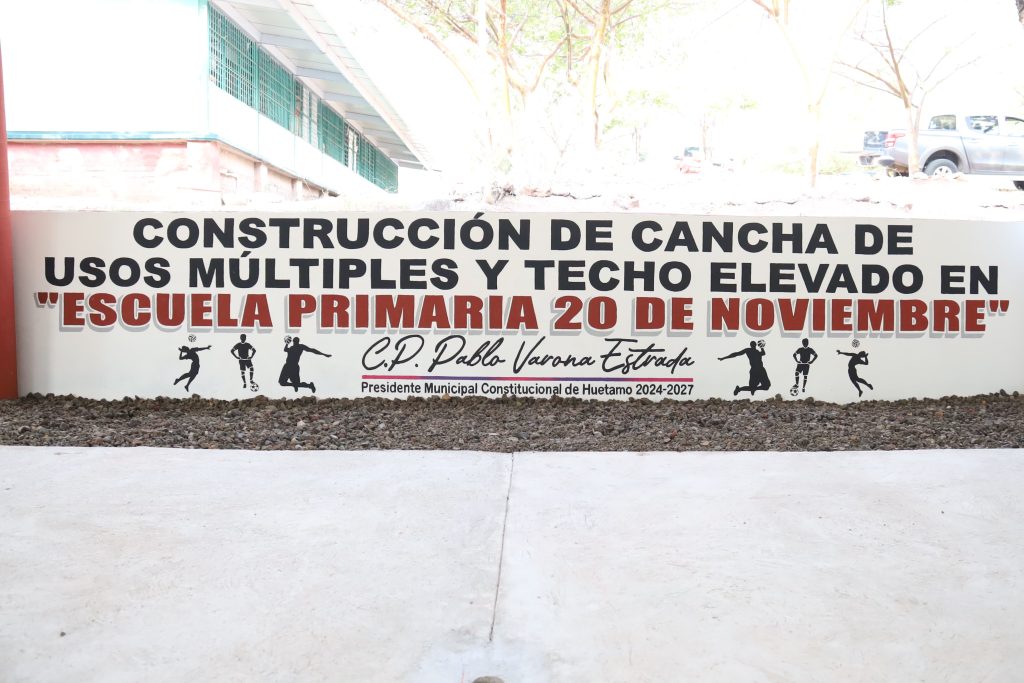 Huetamo, Michoacán. Para continuar cumpliendo el compromiso con el sector educativo, el presidente municipal de Huetamo, Pablo Varona, entregó la obra de construcción de un techo elevado y además una cancha que se construyó desde cero, ya que la que se encontraba en ese sitio estaba totalmente destrozada y ya no podía ser usada.