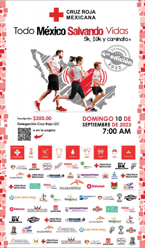 Cd. Lázaro Cárdenas, Mich.El Gobierno Municipal, en coordinación con la Cruz Roja Mexicana Delegación Lázaro Cárdenas, hace la invitación a participar en la 4° Carrera con Causa “Todos México Salvando Vidas”, que se realizará este domingo 10 de septiembre y que tiene como objetivo recaudar fondos para la Benemérita institución.
