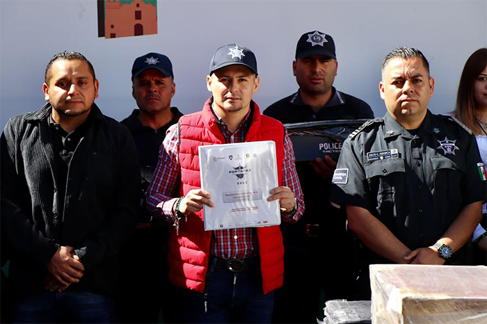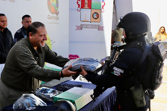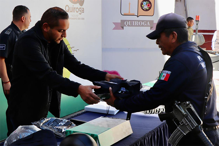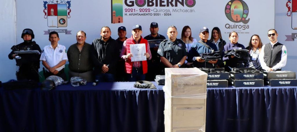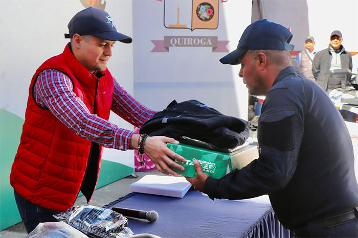 Redacción / La Voz de Michoacán Quiroga, Michoacán. Esta mañana el presidente municipal, Arturo Estrada Barriga, hizo entrega de equipo del programa estatal Fondo de Fortalecimiento para la Paz (FORTAPAZ), con el objetivo de que la policía de Quiroga cuente con más infraestructura para mejorar su imagen y su desempeño en bien de la seguridad de las y los habitantes de nuestro municipio. Se hizo entrega de uniformes para elementos acreditados, una laptop, impresora multifuncional, dos cascos para motocicleta, remodelación del área de barandilla, dos cuatrimotos, una unidad policial pick up. “Es digno de presumir que somos uno de los municipios más seguros de todo el estado con estadísticas y números fríos que se han dado a conocer, hemos ido a la baja en su totalidad de delitos de alto impacto, como los homicidios, secuestros, extorsiones, entre otros. Quiroga es el municipio más seguro de la región y uno de los más seguros del estado, gracias a las labores de logística preventiva que hemos aplicado en la presente administración “, dijo satisfecho de estar entregando buenas cuentas a su pueblo el munícipe.