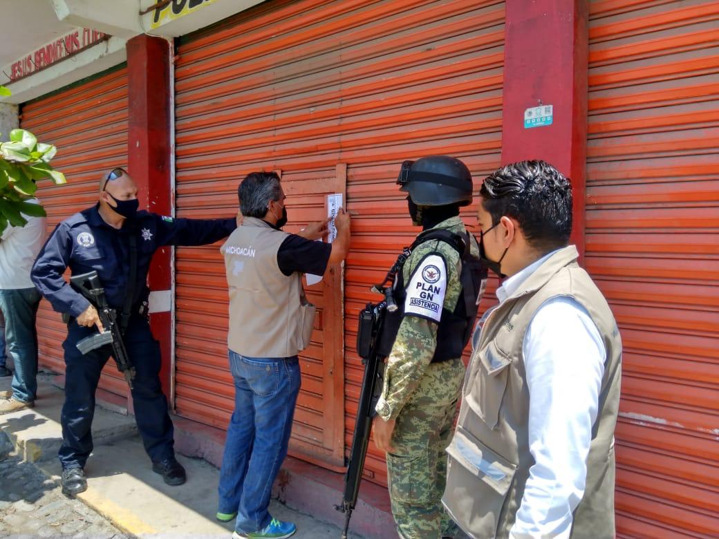 Redacción / La Voz de Michoacán Apatzingán, Michoacán. Derivado del operativo de vigilancia sanitaria para mitigar la propagación del COVID-19 en Apatzingán, 21 establecimientos no esenciales fueron suspendidos por no cumplir con las medidas establecidas por el Gobierno del Estado para la Nueva Convivencia. La acción fue llevada a cabo por la Secretaría de Salud de Michoacán (SSM), a través de la Comisión Estatal para Protección Contra Riesgos Sanitarios (Coepris), que verificó un total de 228 comercios, 153 esenciales y 75 no esenciales. Hasta este sábado Apatzingán sumó 250 casos confirmados de COVID-19, de los cuales 22 han muerto, 127 se recuperaron y 101 están en la fase activa de la enfermedad, por lo que pueden transmitir el virus. Entre los comercios que fueron suspendidos, se encuentran servicios de instalación de audio y video, polarizado de autos y maquinitas, entre otros, los cuales además de no cumplir con las medidas de prevención, brindan servicios no esenciales a la población. Foto: Cortesía. Asimismo, como medida de fomento sanitario se colocaron 456 posters y distribuyeron 832 trípticos informativos sobre los cuidados que los ciudadanos deben implementar para evitar contagiarse. Durante el operativo participaron además, elementos de la Guardia Nacional, Policía Michoacán y Municipal, así como de Protección Civil del Estado y municipio. Foto: Cortesía.
