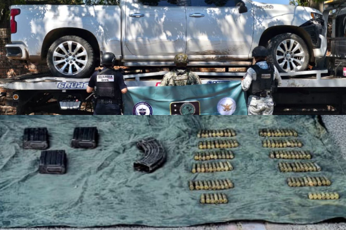Aguililla, Michoacán.- Los operativos interinstitucionales en la Tierra Caliente continúan y ahora en la localidad de Naranjo de Chila se aseguraron municiones y una camioneta, acción efectuada por personal de las secretarías de Seguridad Pública (SSP), y de la Defensa Nacional (Defensa). Fue en las inmediaciones de la citada localidad, donde los agentes de la Guardia Civil, del Ejército Mexicano y la Guardia Nacional (GN), intensificaron sus recorridos de prevención del delito; ahí encontraron una camioneta de la marca Chevrolet, línea Silverado, abandonada en la zona de terracería sin placas de circulación. Al inspeccionar su interior se aseguraron cuatro cargadores y 113 cartuchos útiles para los calibres 7.62X39, 7.62X51 y .45 milímetros. La munición de alto poder, junto a la camioneta serán puestas a disposición de la autoridad correspondiente. Este aseguramiento forma parte de la jornada de operativos coordinados con fuerzas federales que han tenido como resultado el decomiso de armas y municiones de gran calibre, equipo táctico, vehículos y asentamientos en las últimas horas.