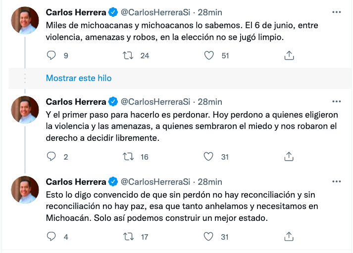 Redacción / La Voz de Michoacán Morelia, Michoacán.- La resolución final de la Sala Superior del Tribunal Electoral del Poder Judicial de la Federación (TEPJF) siembra la duda en el futuro de Michoacán, tras una elección marcada por la violencia, las amenazas e irregularidades de todo tipo, publicó en sus redes sociales el excandidato Carlos Herrera Tello luego de la ratificación de Alfredo Ramírez Bedolla como gobernador. El político dijo además que perdonaba a "quienes eligieron la violencia y las amenazas, a quienes sembraron el miedo y nos robaron el derecho a decidir libremente". La madrugada de este jueves, el TEPJF llevó a cabo la sesión pública convocada para resolver de forma definitiva el juicio madre sobre el proceso electoral en Michoacán, en la cual las y los magistrados desecharon los argumentos para anular la elección, sin embargo se aceptó públicamente que 'el tiro no fue derecho' en los comicios", consideró. Herrera Tello dijo que las y los magistrados expusieron que la elección estatal estuvo manchada de diversas irregularidades y el hecho de no anularla, refleja un estado de derecho vulnerado y se institucionaliza la ilegalidad en los resultados de los procesos electorales. Afirmó, que confió plenamente en que el órgano electoral federal tomaría en cuenta las pruebas presentadas y no las desecharía, tal y como lo realizo el Tribunal Electoral del Estado de Michoacán (TEEM), pero que no sucedió así. "La razón y la justicia hoy no vio la luz, el tiro no fue derecho, las autoridades electorales decidieron en un escenario de mucha presión, y la justicia en Michoacán hoy pierde una batalla más". https://twitter.com/CarlosHerreraSi/status/1443461641677545472?s=20