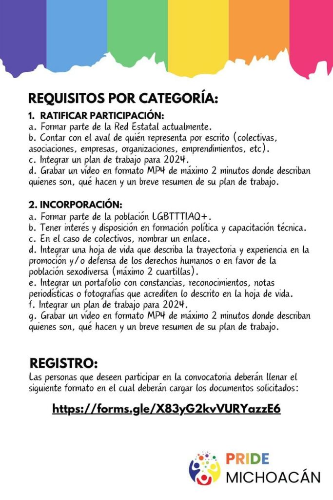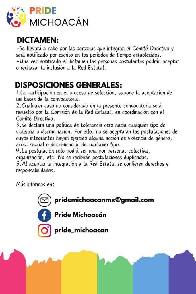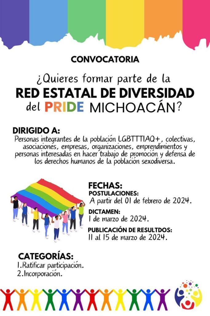 Redacción / La Voz de Michoacán Morelia, Michoacán. Como parte de las estrategias para promover los derechos humanos y visibilizar la diversidad sexual, la Asociación Civil Pride Michoacán, a través de su Comité Directivo, lanzó una convocatoria para participar en la Red Estatal de Diversidad. “A todas las personas integrantes de la población LGBTTTIAQ+, colectivas, asociaciones, organizaciones, empresas, emprendimientos, personas que ejerzan la función pública y cualquier persona interesada que hagan trabajo de promoción y defensa de los derechos humanos de la población de la diversidad sexual, así como labor social y/o comunitaria en favor de la disidencia sexual a formar parte de la Red Estatal de Diversidad del Pride Michoacán”, declararon a través de sus redes sociales. Las postulaciones podrán realizarse hasta el 23 de febrero a través de las redes oficiales de la organización o en el siguiente enlace: https://forms.gle/X83yG2kvVURYazzE6. El dictamen será el 1 de marzo, para darse a conocer del 11 al 15 de marzo. Podrán integrarse o ratificarse aquellas organizaciones, emprendimientos, empresas, asociaciones, colectivos o personas que pertenezcan a la comunidad LGBTTTIAQ+ con interés en la formación política y en la capacitación técnica. Para participar, deberán presentar documentos como su hoja de vida, un portafolio con su trayectoria y un plan de trabajo, así como presentar un video describiendo sus ideas, sus planes y a sí mismes.