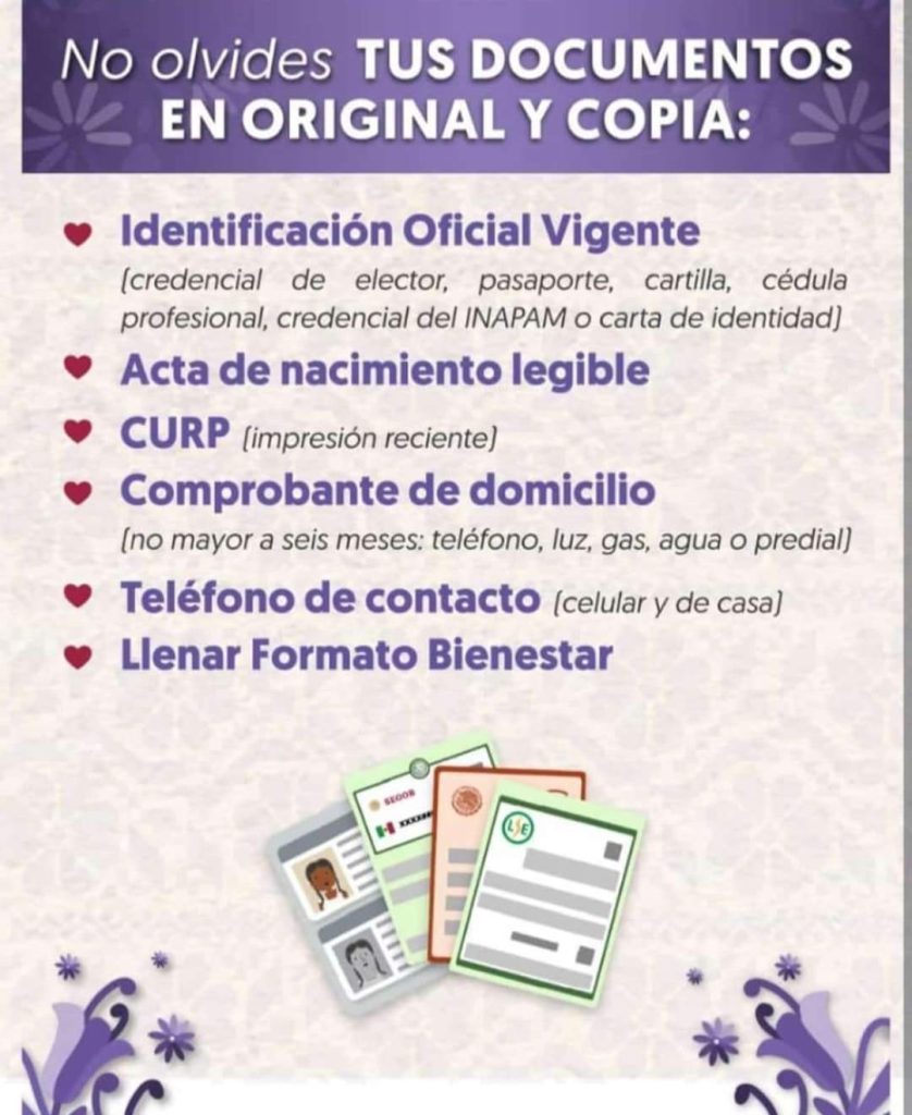 Los documentos que deberán presentar las interesadas son: Identificación Oficial Vigente (Credencial de elector, pasaporte, cartilla, cedula profesional, credencial INAPAM o carta de identidad), Acta de Nacimiento Legible, CURP, Comprobante de domicilio, Teléfono de Contacto y Llenar Formato Bienestar.