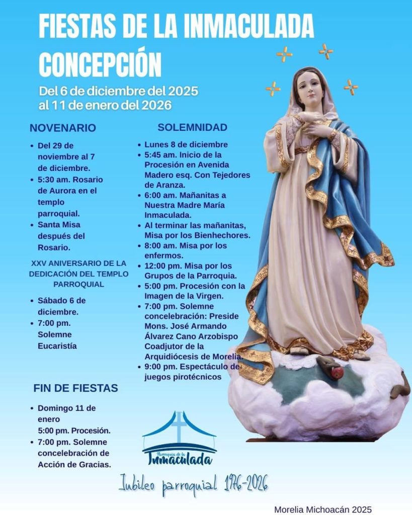 Hoy, 8 de diciembre, la Parroquia de la Virgen Inmaculada Concepción, en la colonia Vasco de Quiroga, inicia la festividad con una procesión en honor a la Virgen.