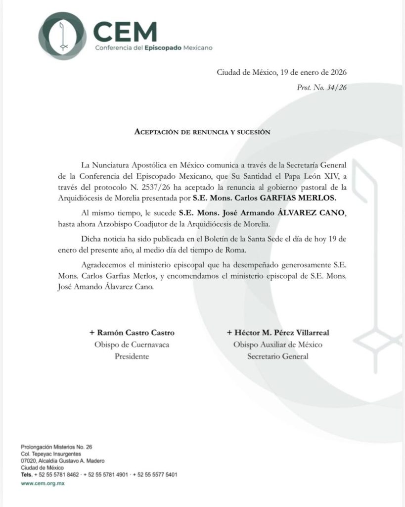 Juan Carlos Huante / La Voz de Michoacán Morelia, Michoacán. El papa León XIV, de acuerdo con los cánones de la Iglesia Católica, aceptó la renuncia, por edad, de Carlos Garfias Merlos como arzobispo de la Arquidiócesis de Morelia, luego de haberla presentado el pasado 9 de enero de 2026, al cumplir 75 años de edad. Por lo anterior, en el mismo segundo en el que boletín de la Santa Sede, Sala Stampa, anunció –12:00 hora de Roma, 05:00 hora del centro de México–: “El Santo Padre ha aceptado la renuncia al gobierno pastoral de la Arquidiócesis Metropolitana de Morelia (México), presentada por S.E. Mons. Carlos Garfias Merlos”, el hasta ahora Arzobispo Coadjutor, José Armando Álvarez Cano, originario de Jiquilpan, Michoacán, asumió el mando administrativo-económico y pastoral de la Arquidiócesis –aunque ya se había realizado la entrega-recepción en ambos rubros en agosto y diciembre de 2025, como su momento lo informó Garfias Merlos–. En su calidad de Coadjutor, el formado en la diócesis de Zamora, desde que tomó posesión como tal en marzo pasado, tenía el “derecho de sucesión”, como lo marca el Canon 403 §3 del Derecho Canónico de la Iglesia Católica: «Al quedar vacante la sede episcopal, el Obispo coadjutor pasa inmediatamente a ser Obispo de la diócesis para la que había sido constituido, siempre que hubiera tomado ya posesión legítimamente». Por su parte, la Conferencia del Episcopado Mexicano y la Nunciatura Apostólica en México, a través de un comunicado difundido a las 5:04 horas de este lunes, confirmaron la aceptación de la renuncia y la sucesión, respectivamente, precisando que la noticia fue publicada en el Boletín de la Santa Sede el día de hoy 19 de enero al mediodía tiempo de Roma. “Agradecemos el ministerio episcopal que ha desempeñado generosamente S.E. Mons. Carlos Garfias Merlos, y encomendamos el ministerio episcopal de S.E. Mons. José Armando Álvarez Cano”. ¿QUIÉN ES EL NUEVO ARZOBISPO? Monseñor José Armando Álvarez Cano nació en Jiquilpan, Michoacán, el 30 de enero de 1960, siendo el tercero de diez hermanos. Cursó sus estudios de secundaria, filosofía y teología en el Seminario de Zamora. Fue ordenado sacerdote el 8 de febrero de 1986 por la misma diócesis, y después de 6 años como vicario parroquial, en 1992 vivió una experiencia de misión en la diócesis de Tecna, Perú. A su regreso obtuvo el posgrado en Teología Pastoral en la Universidad Pontificia de México. Otros servicios que prestó fueron: responsable de la Comisión Diocesana para el Clero, Vicario de Pastoral y párroco en diversas ocasiones. El 3 de noviembre de 2011, el papa Benedicto XVI lo nombró obispo de la Prelatura territorial de Huautla, y el 30 de enero de 2012 recibió la ordenación episcopal; posteriormente, el papa Francisco lo nombró obispo de la diócesis de Tampico el 11 de mayo de 2019, tomando posesión el 5 de junio del mismo año. El 25 de enero de 2025, el papa Francisco lo nombró Arzobispo Coadjutor de la Arquidiócesis de Morelia, y el 17 de marzo tomó posesión en una multitudinaria celebración eucarística en el Palacio del Arte. “ME VOY MUY EN PAZ” El pasado 4 de enero, en conferencia de prensa en el claustro de la Mitra, a un costado de la Catedral de Morelia, monseñor Carlos Garfias Merlos aseguró irse “muy en paz, con mucha satisfacción y muy agradecido con Dios”. Al ser abordado sobre su balance personal y pastoral al dejar la Arquidiócesis, mencionó que ésta se encuentra en buen momento en todo el tema pastoral y de servicio, resaltando la pastoral social, “sobre todo que se está buscando siempre el compromiso en la construcción de la paz”. Respecto a que si hubiera querido dejar algo concluido y que ahora quedará como reto para su sucesor, manifestó que todo podría haberse avanzado más y siempre hay perspectiva de futuro. “Cada quien tenemos nuestro tiempo, creo que el tiempo para mí se ha concluido y espero que monseñor Armando le dé continuidad y ayude o impulse lo que ha quedado pendiente”.