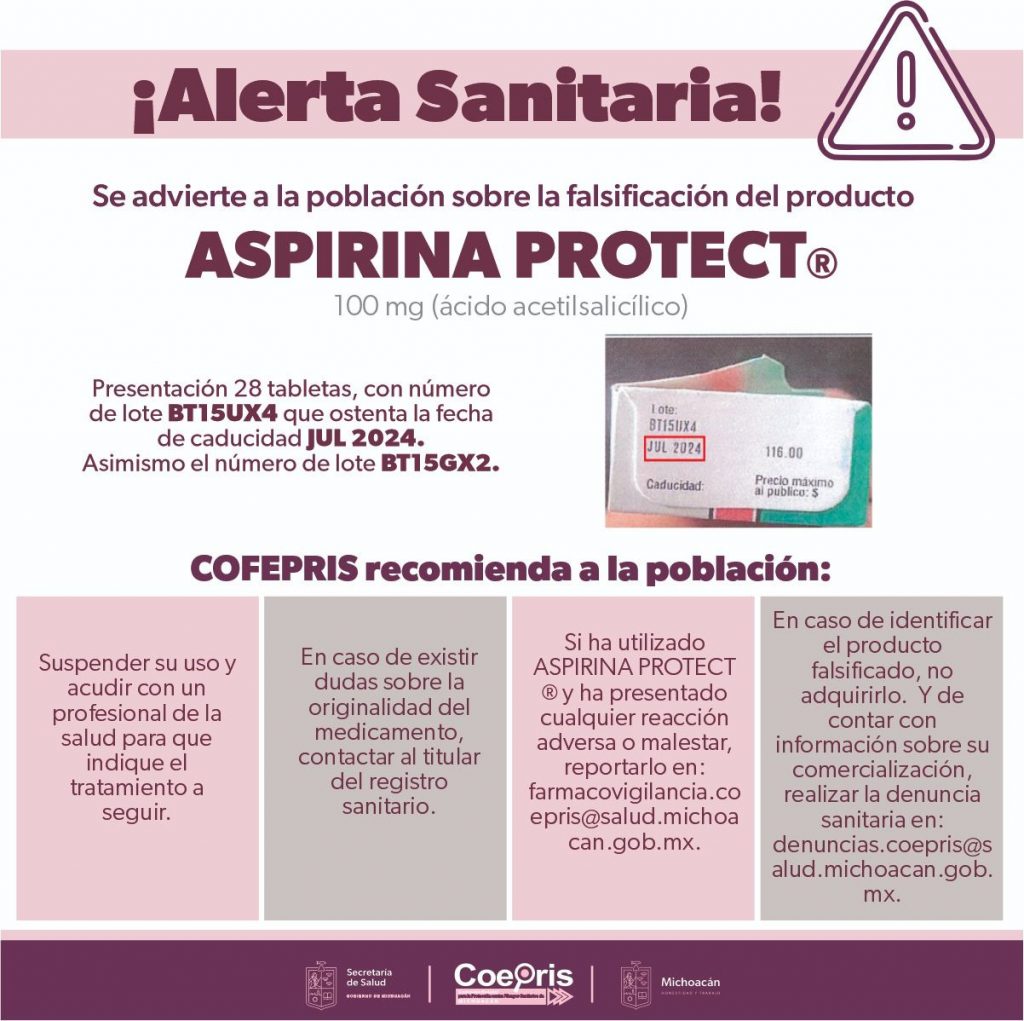Redacción / La Voz de Michoacán Morelia, Michoacán. La Comisión Federal para la Protección contra Riesgos Sanitarios (Cofepris), a través de la Secretaría de Salud de Michoacán (SSM), alerta a la población sobre la falsificación del medicamento Aspirina Protect de 100 mg (ácido acetilsalicílico) en presentación de 28 tabletas, con número de lote BT15UX4 y fecha de caducidad JUL 2024. El producto original debe contar con número de lote BT15UX4, pero fecha de caducidad de SEP 2023, por lo que representa un riesgo para la salud de la población debido a que se desconocen las condiciones e ingredientes para su fabricación, su manipulación y almacenamiento, por lo que no se garantiza su seguridad, calidad y eficacia. En caso de identificar el producto falsificado con las características antes mencionadas, se recomienda no adquirirlo, y en caso de contar con información sobre la posible comercialización se debe realizar la denuncia sanitaria al correo: denuncias.coepris@salud.michoacan.gob.mx. Con el fin de evitar que productos, empresas o establecimientos incumplan con la legislación sanitaria vigente, la Coepris Michoacán mantendrá acciones de vigilancia y control sanitario en farmacias del estado, para así proteger la salud de la población.