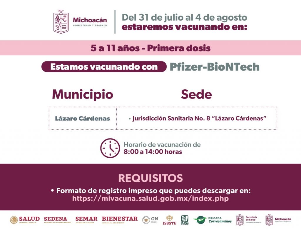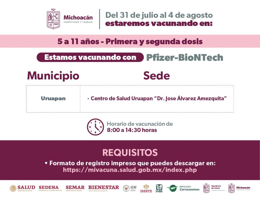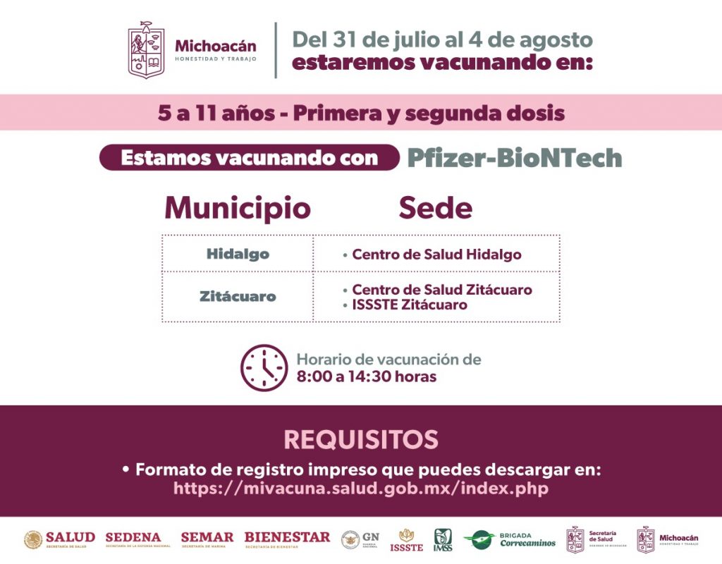 Redacción / La Voz de Michoacán Morelia, Michoacán. Del 31 de julio al 4 de agosto, la Secretaría de Salud de Michoacán (SSM) aplicará la vacuna Pfizer contra el COVID-19, a niños de 5 a 11 años de edad, en los municipios de Uruapan, Hidalgo, Lázaro Cárdenas y Zitácuaro. Primeras y segundas dosis son las que podrán solicitar los padres de familia o tutores para los infantes, en los cuatro municipios de la entidad, para dar continuidad al Plan Nacional de Salud. Hasta el último corte, en Michoacán se han aplicado 754 mil 233 dosis de vacuna Pfizer a igual número de niños y niñas de 5 a 11 años de edad, biológico seguro y necesario para continuar la tendencia a la baja de nuevos casos de COVID-19. En Uruapan, Zitácuaro e Hidalgo la vacunación se realizará en los centros de salud, mientras que en Lázaro Cárdenas el módulo de inmunización permanecerá instalado en la Jurisdicción Sanitaria. Los interesados deberán presentarse con el formato de registro prellenado, que se puede descargar en la página de Mi Vacuna: https://mivacuna.salud.gob.mx/index.php. La segunda dosis de vacuna Pfizer para niños de 5 a 11 años de edad se debe aplicar de 21 a 42 días después de la primera dosis, por lo que la SSM exhorta a la población a llevar a inmunizar a sus hijos.