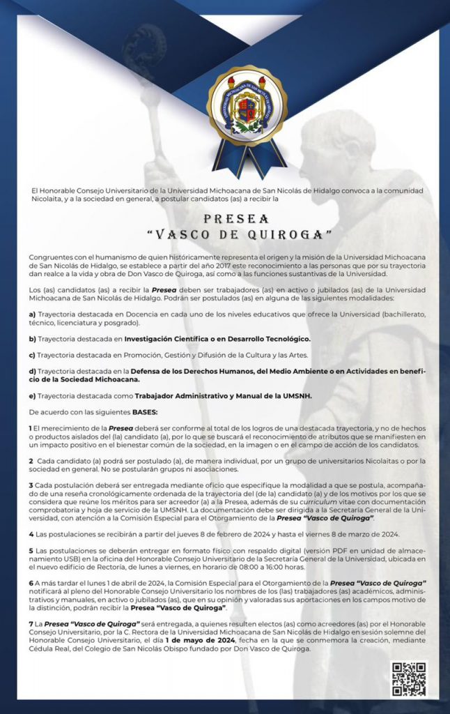 Morelia, Michoacán.- Con el fin de reconocer a las personas que por su trayectoria dan realce a la vida y obra de Don Vasco de Quiroga, así como a las funciones sustantivas de la Universidad Michoacana de San Nicolás de Hidalgo (UMSNH), el Consejo Universitario dio a conocer la convocatoria para la entrega de la Presea “Vasco de Quiroga” 2024.