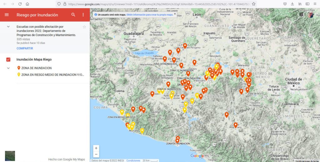 Redacción / La Voz de Michoacán Morelia, Michoacán. Ante las lluvias registradas durante los últimos días en la capital y algunos municipios, la Secretaría de Educación del Estado (SEE) habilitó un mapa interactivo para detectar las escuelas michoacanas que presentan algún tipo de riesgo, además de la página de internet para reportar los daños por fenómenos meteorológicos. A través de la liga: https://bit.ly/3v3V0jH, se puede revisar la ubicación y cada una de las escuelas en riesgo, y en el link http://see.gob.mx/reporte/, directivos pueden registrar los daños presentados en los planteles, por lluvias así como por incendios, huracanes, sismos u otras causas. Para ello, los directivos deberán ingresar la Clave del Centro de Trabajo, teléfono, correo electrónico, nombre del responsable, tipo de incidencia, comentarios y adjuntar evidencia. Asimismo, se hace una serie de recomendaciones para disminuir el riesgo de incidentes durante las tormentas, como es desconectar la energía eléctrica, mantener en lugares seguros equipos, productos, materiales y documentos que se pudieran deteriorar con la humedad; además se pide evitar acumular basura, retirar todos los objetos que pudieran ser arrastrados por el agua y cerrar bien todas las puertas y ventanas. Durante la temporada de lluvias es necesario realizar jornadas constantes de limpieza en azoteas, para el desazolve de las bajadas de agua de lluvia, limpiar las coladeras de basura, hojas y ramas que pudieran bloquear el drenaje pluvial. De igual manera se invita a realizar un diagnóstico de los árboles que pudieran ser un riesgo en los planteles y proceder a podarlos, tapar tinacos y aljibes para no contaminar el agua y evitar la acumulación y generación de criaderos del mosco Aedes aegypti, transmisor del dengue, zika y chikungunya.