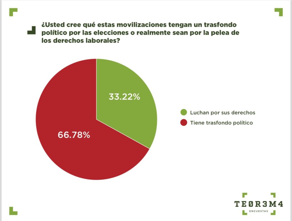 Morelia, Michoacán.- Las recientes movilizaciones por parte del Sindicato de Trabajadores al Servicio del Poder Ejecutivo tienen una motivación política en el contexto de las próximas elecciones del dos de junio, reconoció la ciudadanía, de acuerdo a la última encuesta de opinión realizada por la casa Teorema. Y es que el 66.78 por ciento de los encuestados señaló que las manifestaciones y toma de calles son una medida de presión motivada por las campañas políticas, mientras que sólo el 33.22 por ciento de los encuestados señaló que pelean por sus derechos laborales. De igual forma, siete de cada 10 encuestados dijo estar en desacuerdo con que el sindicato genera cortes a la circulación vehicular como parte de sus manifestaciones, mientras que sólo tres de cada diez encuestados dijo apoyar la medida. Mientras tanto, al ser cuestionados respecto a las posibles afectaciones a los trabajadores del estado generadas por las tomas del STASPE, el 75.16 por ciento de los encuestados dijo estar en desacuerdo, pero que los trabajadores no tienen la culpa de las movilizaciones con motivación política por parte del sindicato.