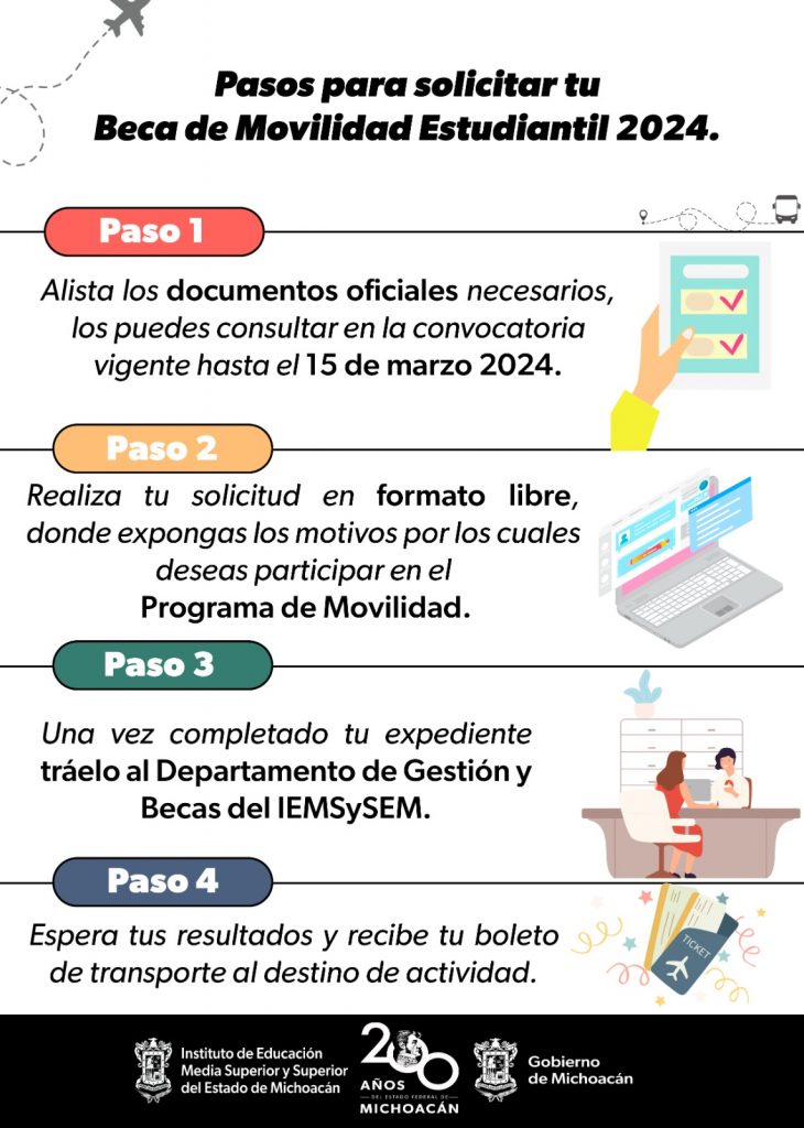 Redacción / La Voz de Michoacán Morelia, Michoacán. El Instituto de Educación Media Superior y Superior del Estado de Michoacán (Iemsysem) hace un llamado a estudiantes michoacanos de bachillerato, licenciatura y de posgrado a participar en el Programa de Becas de Movilidad Estudiantil 2024, la cual cierra el próximo 15 de marzo. De manera muy sencilla pueden solicitar apoyo de transporte terrestre o aéreo por hasta 40 mil pesos para intercambios estudiantiles, estadías profesionales, de investigación o de participación en algún torneo o competencia deportiva o cultural, cuyos requisitos son los siguientes: • Ser estudiante de nivel medio superior y superior de alguna institución educativa asentada en Michoacán o en caso de estar en alguna otra en el interior del país, comprobar ser de origen michoacano • Carta de aceptación de la institución en donde realizará la actividad académica, deportiva o cultural • Tener un promedio mínimo de 8.0 • Llenar la solicitud correspondiente La solicitud es en formato libre, ahí se debe exponer los motivos por los cuales se desea participar en el programa de movilidad, las fechas de la actividad educativa y el lugar a donde se pretende trasladar, el resto de documentos oficiales necesarios se pueden consultar en la convocatoria vigente hasta el 15 de marzo: https://iemsysem.michoacan.gob.mx/convocatorias. Una vez completado el expediente de la o el interesado, la solicitud será turnada al Comité de Becas del Iemsysem, quien analizará y aprobará la misma, para posteriormente entregar el boleto de transporte al destino de la actividad. Se recomienda a las y los jóvenes interesados realizar los trámites con antelación, a fin de que el costo de traslados pueda cubrirse dentro del rango de apoyo establecido, por lo que, en caso de realizar alguna actividad en verano próximo, inicien su trámite y solicitud en la presente convocatoria.