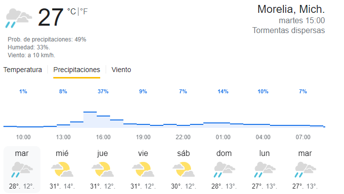 De acuerdo al Sistema Meteorológico Nacional, se pronostica una temperatura máxima de 28 grados y una mínima de 12 en Morelia