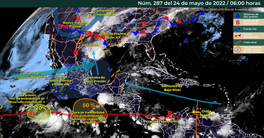Se pronostica para el Pacífico Norte ambiente matutino de templado a fresco y frío en zonas serranas del oriente de Sonora, así como caluroso hacia la tarde. Se espera cielo despejado la mayor parte del día y viento del oeste y suroeste de 15 a 30 km/h en la región, con rachas de 50 a 60 km/h en Sonora. Para el Pacífico Centro, se estima Cielo parcialmente nublado con ambiente fresco durante la mañana, cielo nublado y caluroso a muy caluroso por la tarde. Se prevén descargas eléctricas en Jalisco y Michoacán, además de viento de componente oeste de 15 a 30 km/h en la región, con rachas de 50 a 60 km/h en el norte de Jalisco.