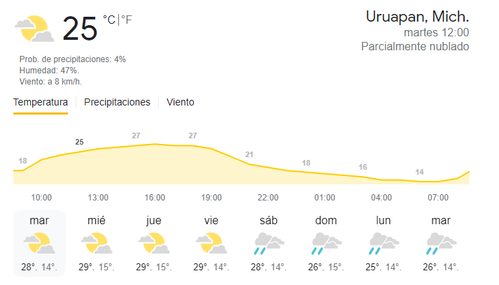 En Uruapan se pronostica un día nublado con una máxima de 28 grados y una mínima de 14.