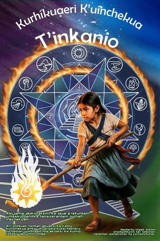 Angélica Ayala / Colaboradora La Voz de Michoacán Pátzcuaro, Michoacán. - Una de las fechas más importantes para los pueblos purépechas es el K’urhíkuaeri Kuinchekua, (Fuego y Año Nuevo Purépecha) que se realiza cada primero de febrero, con el encendido del fuego cuando la constelación de Orión se encuentra en el cenit. Es así que, este año, el municipio de Tingambato es la sede de este encuentro de las cuatro regiones purépechas de Michoacán, por cual se dio a conocer el cartel oficial de esta ceremonia ancestral que se retomó hace 43 años. De acuerdo con un texto emitido por Pavel Ulianov Cruz Macario, defensor de las comunidades indígenas y vocero del Consejo Supremo Indígena de Michoacán (CSIM), el cartel es una obra de “profunda carga simbólica que condensa la cosmovisión, historia y valores del pueblo purépecha desde la perspectiva de la comunidad de Tingambato”. Además de que la creación fue el resultado de un proceso participativo “que incluyó a encargados, comisionados, consejeros y artistas, buscando reflejar la identidad local y regional en el marco de la ceremonia del Fuego Nuevo”. De tal manera que va explicando cada uno de los elementos que integran la imagen, en donde destaca una niña purépecha jugando el juego de pelota encendida, “en el corazón del diseño se encuentra el isotipo de la espiral, que representa el movimiento, el ciclo de la vida y la conexión con el linaje ancestral (surukua). Este símbolo alude al nacimiento del fuego, deidad principal del pueblo p’urhé, y se integra con la piedra del juego de pelota de Tingambato, que contiene una estrella de ocho puntas indicadora del culto al Sol y al calendario cósmico”. Cruz Macario explicó a través de su escruto, que a este conjunto simbólico “se suma la Yacata de la luna del centro ceremonial de nuestra comunidad, elemento fundamental que representa el orden del tiempo, la energía femenina y la memoria histórica de Tingambato como territorio sagrado. Su presencia reafirma el vínculo profundo entre el cielo, la tierra y los ciclos que rigen la vida comunitaria”. Asimismo, aborda el significado del lugar donde se realizará el encendido del fuego nuevo, “el nombre T’inkanio, raíz ancestral de Tingambato, define el concepto central del cartel: el ‘lugar donde inicia el fuego, marcando tanto un límite climático entre las tierras bajas y templadas como un sitio ceremonial de gran relevancia, asociado al dios K’urhíkuaeri y a los saberes ancestrales que perviven hasta nuestros días”. La estructura visual del cartel funciona como un mapa cosmogónico y territorial, señala, ya que se incorporan los colores de la bandera purépecha, “dispuestos siguiendo la lógica geográfica de las cuatro regiones: amarillo para la Cañada, morado para la Ciénaga, verde para la Meseta representando a Tingambato y azul para la región lacustre”. Además, señala que el plano cósmico, el cartel integra los tres niveles de la existencia: el cielo, Auandarhu donde habita Kurhíkuaeri, la tierra, Echendirhu donde se encuentra Kuerauájperi y el inframundo Kuemiejchúcuaro, “expresando el equilibrio entre las fuerzas masculinas y femeninas que sostienen la creación. De acuerdo con la información aportada, el cartel también exalta los pilares éticos de la vida comunal, que son: el pensamiento filosófico, la honorabilidad, el trabajo que dignifica y la ayuda mutua, valores que se entrelazan con elementos distintivos de Tingambato, como las danzas de Los Negritos y Los Moros, el cultivo del geranio (fruto del trabajo tradicional femenino), la música local y la yunta, símbolo de la relación respetuosa y simbiótica con la tierra. En el cartel destaca la imagen de una niña practicando el juego de la Uarhukua, “una elección que rinde homenaje al papel fundamental de las mujeres y a su liderazgo creciente en la preservación y continuidad de los ceremoniales ancestrales. “La obra culmina con un mensaje de invitación, memoria y resistencia cultural, que convoca a la comunidad y a los pueblos hermanos a reunirse en torno al fuego sagrado, a reconocer nuestras raíces y a fortalecer nuestra forma de vida, en el marco de la cuadragésima cuarta celebración del Fuego Nuevo, que tendrá lugar en febrero de 2026 en el centro ceremonial y civil del pueblo de Tingambato”, señala. Este año, el municipio de Tingambato será la sede de este encuentro de las cuatro regiones originarias. La obra es un mensaje de invitación, memoria y resistencia cultural, que convoca a la comunidad y a los pueblos hermanos a reunirse en torno al fuego sagrado, a reconocer nuestras raíces y forma de vida Es una elección que rinde homenaje al papel fundamental de las mujeres y a su liderazgo creciente en la comunidad