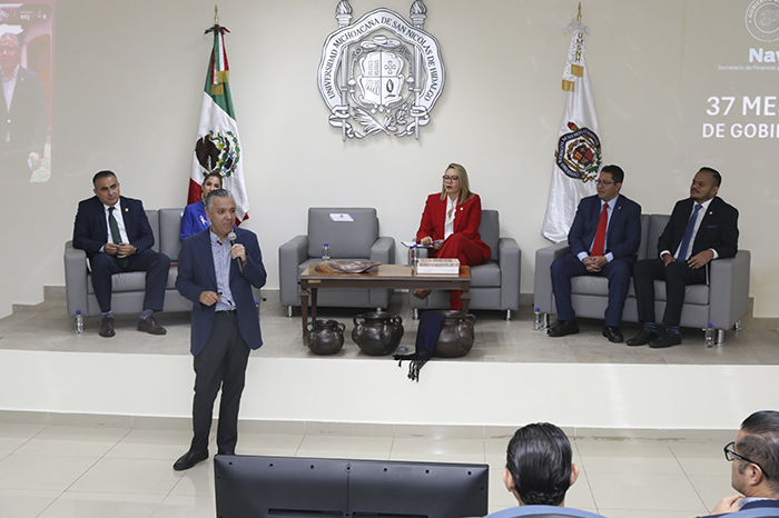Por su parte, la rectora Yarabí Ávila agradeció la presencia del secretario de Finanzas, Luis Navarro, y el compartir su experiencia con las y los nicolaitas, ahí reconoció el compromiso y el trabajo que ha desarrollado el funcionario, tras referir que para desempañar su labor no solamente se requiere conocer de finanzas, “sino que se habla de una sensibilidad y una empatía por el estado”.