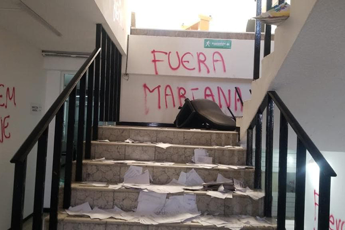 Redacción / La Voz de Michoacán Morelia, Michoacán. La mañana de este miércoles se reportó un atentado al Instituto de Educación Media Superior y Superior del Estado de Michoacán (IEMSySEM) por parte de miembros de la Organización de Normales Oficiales de Michoacán (ONOEM) Por lo anterior se detalló que la institución promoverá las denuncias respectivas contra quien resulte responsable de los daños. Sobre los hechos, se sabe que cerca de las 11:00 de la mañana, comenzó una manifestación que posteriormente se convirtió en un allanamiento violento a las instalaciones del IEMSySEM, lo que provocó movilizaciones al interior del edificio para evacuar a las y los trabajadores, ya que se ponía en riesgo su integridad física, según detallaron fuentes de gobierno. El jefe del Departamento de Normales, René Gerardo Ochoa Gallardo, no logró abandonar el edificio, ya que, al momento de su salida, integrantes de la ONOEM lo retuvieron al interior, de la misma manera que a personal administrativo de otras áreas. Ante lo anterior se emitió un comunicado que señala: "El IEMSySEM condena enérgicamente estos hechos que claramente no fueron ocasionados por estudiantes, sino por personas que se escudan bajo la figura de supuestos representantes estudiantiles". También se expresó "Las instalaciones fueron visiblemente dañadas, ya que el edificio fue vandalizado en su totalidad: destrozaron computadoras, mobiliario, documentos, artículos personales de las y los trabajadores, cristales y plantas ornamentales. El personal resultó afectado directamente y se reportaron varios cuadros de crisis nerviosas". Al momento personal del área jurídica del IEMSySEM levanta un registro de los daños ocasionados, con el propósito de sustentar las denuncias que se promoverán en contra de quienes resulten responsables. Miembros de la ONOEM han realizado diversas manifestaciones que van dese marchas hasta quema de vehículos debido a que se oponen a los nuevos mecanismos de examen de ingreso a las normales del estado.
