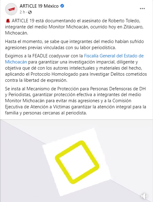 Redacción / La Voz de Michoacán Morelia, Michoacán. Al mediodía de este lunes, un colaborador del portal informativo Monitor Michoacán fue víctima de una agresión armada en la cochera de un despacho jurídico ubicado en la colonia Moctezuma Oriente, de la Ciudad de Zitácuaro. Sin embargo, la Fiscalía estatal informó que no se tienen antecedentes de las amenazas contra el portal y el periodista, en tanto que el Ayuntamiento se refiere a Roberto Toledo como “colaborador técnico de un despacho de abogados en el municipio”. Fue cerca de las 13:40 horas, cuando a los números de emergencias se recibió el reporte de que había una persona lesionada a balazos en el despacho “Vera Abogados”, localizado en la calle Andrés Landa y Piña. Por lo anterior acudieron los Bomberos Zitácuaro los cuales hallaron lesionado Roberto Toledo de 59 años de edad, mismo que de emergencia fue subido a un hospital local, sin embargo, lamentablemente perdió la existencia en el trayecto. Al ser entrevistado por Milenio Televisión, Armando Linares informó: Fue uno de nuestros colaboradores el que fue asesinado esta tarde aquí en esta ciudad de Zitácuaro, él nos hacía algunas videonotas, algunas notas y se encargaba prácticamente de cubrir información de gobierno del estado, normalmente él guardaba un perfil bajo precisamente para evitar alguna situación, dadas las amenazas que ya traemos desde hace meses”. No hay amenazas: Fiscalía Al consultar a la Fiscalía General del Estado sobre denuncias por amenazas en agravio del finado, la dependencia señaló que no hay antecedentes. Sobre el lamentable hecho, la FGE informó que se inició carpeta de investigación por el homicidio. Además, la dependencia señaló que en la zona fueron aseguradas 2 cartulinas en las que un grupo delictivo amenaza criminales de otro bando y se atribuye el crimen. Para Ayuntamiento no era periodista Por su parte, el Ayuntamiento de Zitácuaro no mencionó que Roberto Toledo tuviera relación con el periodismo. Mediante un boletín, señaló que la administración “que encabeza Juan Antonio Ixtláhuac, coadyuvará con las autoridades correspondientes, para esclarecer el lamentable asesinato de Roberto T., colaborador técnico de un despacho de abogados en el municipio”. En los siguientes párrafos del boletín, el gobierno municipal ya habla de sí mismo y su compromiso; sin embargo, al final del escrito menciona que seguirán gestionando para que "las instituciones responsables de intervenir en los delitos del fuero federal sean coadyuvantes con nosotros en esclarecer este lamentable suceso". Por su parte, en un mensaje a los medios de comunicación, el presidente Antonio Ixtláhuac negó de forma tajante que Roberto Toledo fuera periodista, y acusó que los medios quisieran "cambiar" la realidad. Artículo 19 exige acción También esta tarde, la organización Artículo 19 se pronunció sobre el asesinato del periodista. En sus redes sociales informaron que ya están documentando el homicidio, por lo que exigen a la Fiscalía Especializada en Delitos contra la Libertad de Expresión coadyuvar con la FGE “para garantizar una investigación imparcial, diligente y objetiva que dé con los autores intelectuales y materiales del hecho, aplicando el Protocolo Homologado para Investigar Delitos cometidos contra la libertad de expresión”. Así mismo, insta al Mecanismo de Protección para Personas Defensoras de DH y Periodistas, garantizar protección a integrantes de Monitor Michoacán para evitar más agresiones y a la Comisión Ejecutiva de Atención a Víctimas garantizar la atención integral para la familia y personas cercanas al periodista.