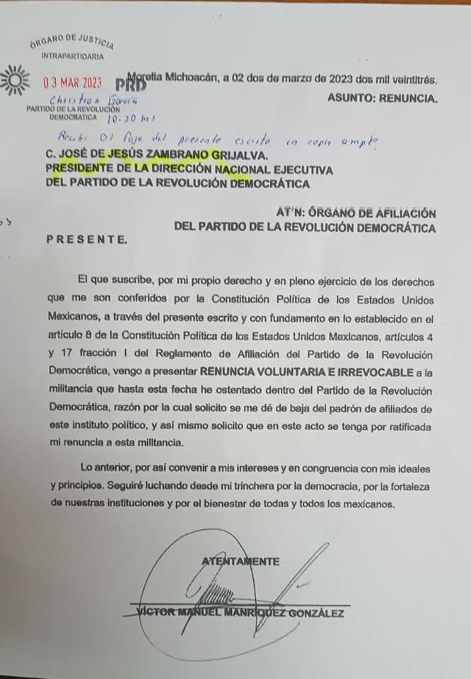 Redacción / La Voz de Michoacán Morelia, Michoacán. Víctor Manuel Manríquez, coordinador del grupo parlamentario del PRD, renunció a su militancia en el Sol Azteca. A través de un documento, informó que por su propio derecho y en pleno ejercicio de los derechos que le son conferidos por la Constitución Política de los Estados Unidos Mexicanos, presentó su renuncia voluntaria e irrecobale. Manuel Manríquez mencionó que lo anterior es por convenir a sus intereses y en congruencia con sus ideales y principios. Además, agradeció, al Partido de la Revolución Democrática que lo vio crecer, y a sus dirigentes por la oportunidad de militar todo este tiempo y les deseó lo mejor, en lo personal y en lo político. Desde el año 2000 he militado en el Partido de la Revolución Democrática, son ya veintitrés años de luchas y aportaciones por una sociedad democrática y equitativa, años de esfuerzos encaminados a un beneficio para toda la sociedad, años que han representado grandes cambios para todas y todos sin distinción alguna, me enorgullece todo aquello que a lo largo de la historia el PRD ha aportado a nuestro País, como la equidad de oportunidades entre hombres y mujeres, la lucha de una democracia en nuestro País y la abolición del autoritarismo gubernamental, principios y logros que me motivaron a luchar del lado del partido del Sol Azteca. Víctor Manuel Manríquez dijo que se encuentra eternamente agradecido con el partido, que le ha permitido la gran oportunidad de emprender caminos de representación para las y los michoacanos, asumiendo cargos que le llenan de grandes experiencias como Integrante de la Comisión Nacional de Garantías del Partido de la Revolución Democrática, Diputado Federal en la LXII Legislatura, Presidente Municipal de Uruapan, Michoacán en dos ocasiones, Presidente de la Dirección Estatal Ejecutiva del Partido de la Revolución Democrática en el Estado de Michoacán y ahora Diputado de la LXXV Legislatura del Congreso del Estado de Michoacán. Cargos que he representado conforme a los ideales de una izquierda congruente, de una izquierda de principios brindado mejores condiciones para la sociedad michoacana.