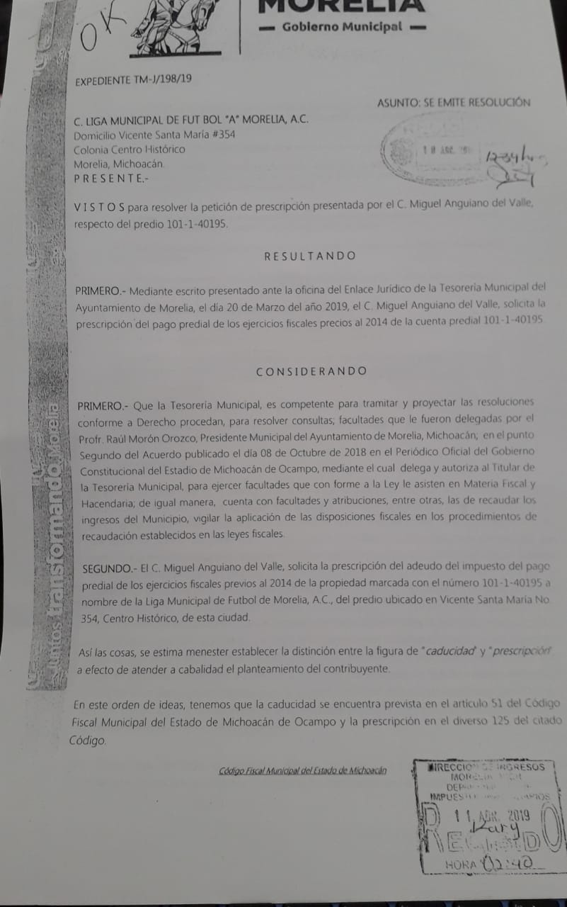 El pasado 20 de marzo del 2019, solo días después de la revelación de los presuntos casos de nepotismo, la oficina del enlace jurídico de la Tesorería municipal recibió una carta del ciudadano “Miguel A”. En el documento, se solicitaba la prescripción de los adeudos del pago Predial del domicilio de Vicente Santa María número 354, el cual presentaba falta de pagos desde el 2004. En menos de un mes, la tesorera del Ayuntamiento de Morelia, María de los Remedios López Moreno, resolvió de forma positiva la “caducidad” de la deuda desde el citado año y hasta el 2011.