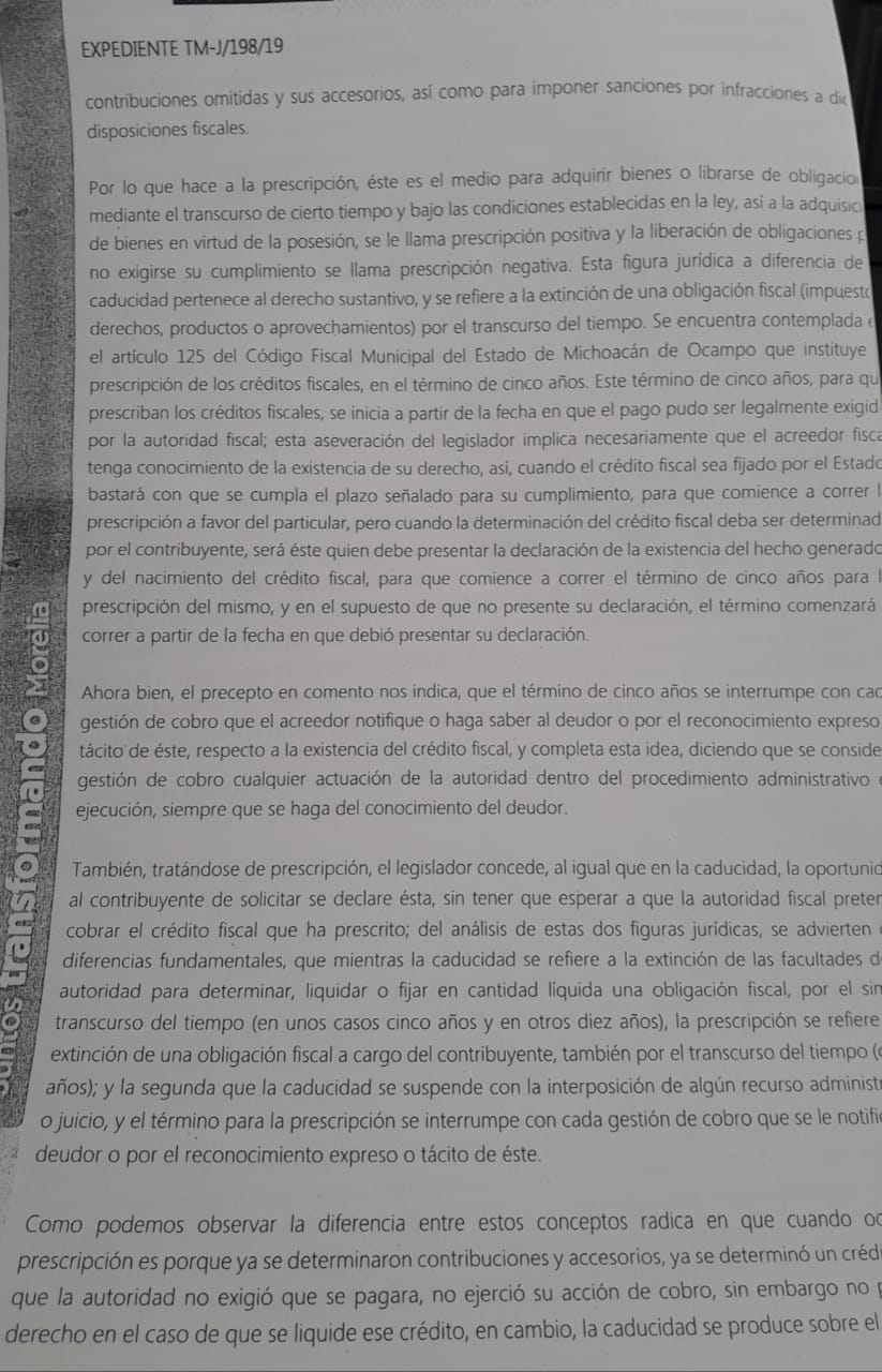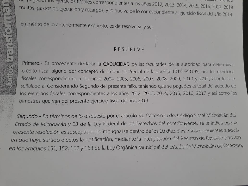 El mismo expediente expone en términos técnicos que, después de cinco años desde que se dio aviso por última vez para liquidar la deuda, se extingue la facultad de la autoridad recaudadora para requerir el pago. “El artículo 51 del Código fiscal Municipal del Estado de Michoacán establece el plazo de cinco años para que se extingan las facultades de las autoridades fiscales para comprobar el cumplimiento de las disposiciones fiscales, de terminar las contribuciones omitidas y sus accesorios, así como para imponer sanciones o infracción a dichas disposiciones”, dice el documento.