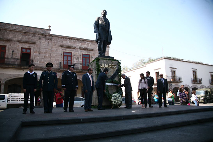 Tsuri Chávez/La Voz de Michoacán Morelia, Michoacán. Recordar el coraje y la mente inquieta, así como la lucha contra la pestilente oligarquía que saqueaba al país en la época de Benito Juárez, fue la invitación que hizo el orador oficial en el 212 aniversario del Natalicio de Benito Juárez. Saúl Padilla, integrante de la Gran Logia Masónica Michoacan, quién fue el orador oficial invitó a rememorar la lucha del pensamiento liberal del Benemérito de las Américas y así limpiar las instituciones actuales de la corrupción. El evento se acompañó de un número musical, la participación de la primaria Instituto Juárez, de la colocación de la ofrenda floral en la estatua a Benito Juárez y de la banda de guerra del Ejército.
