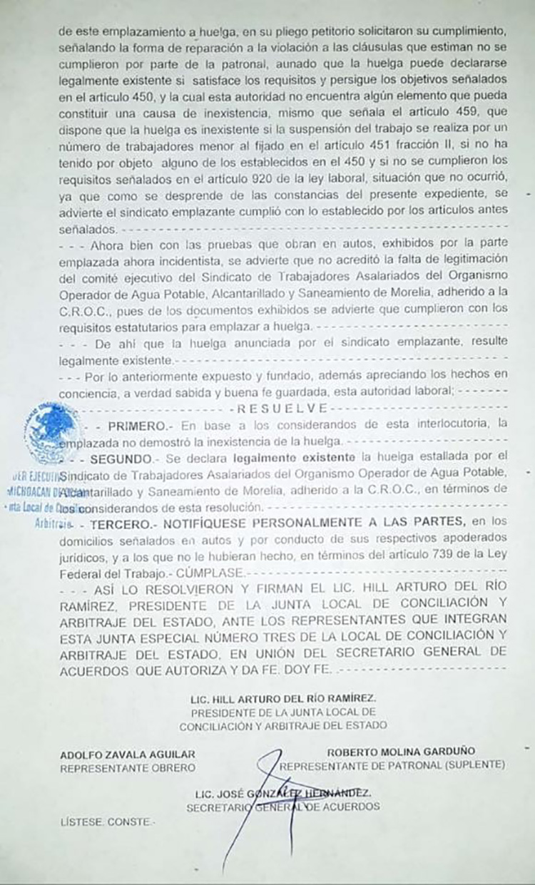 Redacción / La Voz de Michoacán Morelia, Michoacán. La Junta Local de Conciliación y Arbitraje declaró existente la huelga estallada por el Sindicato de Trabajadores Asalariados del Organismo Operador de Agua Potable, Alcantarillado y Saneamiento de Morelia desde el pasado 18 de junio. Según el fallo y a través de las pruebas que obran en autos, exhibidos por la parte emplazada ahora incidentista, se advirtió que no acreditó la falta de legitimación del comité ejecutivo por lo que resolvió lo siguiente: Primero, que en base a los considerandos, la (parte) emplazada (el Ooapas) no demostró la inexistencia de la huelga. Segundo, que se declara legalmente existente la huelga estallada por el sindicato y tercero, que se notifique a ambas partes por conducto de sus respectivos apoderados jurídicos.
