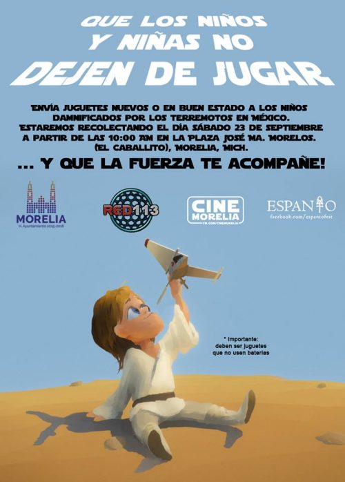 Redacción Web/ La Voz de Michoacán Morelia, Michoacán. A Jojutla no solo llegarán víveres de necesidad básica, también se “pintarán” sonrisas en niños de esta zona con juguetes que recolectan morelianos este sábado. Desde temprana hora, en la Plaza Jardín Morelos, mejor conocida como “El Caballito” se lleva a cabo una colecta de juguetes sin pila para aquellos niños que perdieron sus cosas tras el fuerte sismo que cimbró el centro del país. Familias ya han aportado su “granito de arena” a esta causa. Será hoy hasta las 20:00 horas y durante el día de mañana qeu se mantenga la colecta que ha sido difundida con #QueLosNiñosyNiñasNoDejenDeJugar. Además de los juguetes, se recibe ropa (para niña y niño), pañales, leche en polvo, así como alimentos no perecederos, medicamentos y material de curación. RED113 Michoacán y ESPANTO comprometidos con la causa, llevarán personalmente todo lo que se junte en la recolecta de “alegría” para los pequeños que vivieron el terremoto del 19 de septiembre.