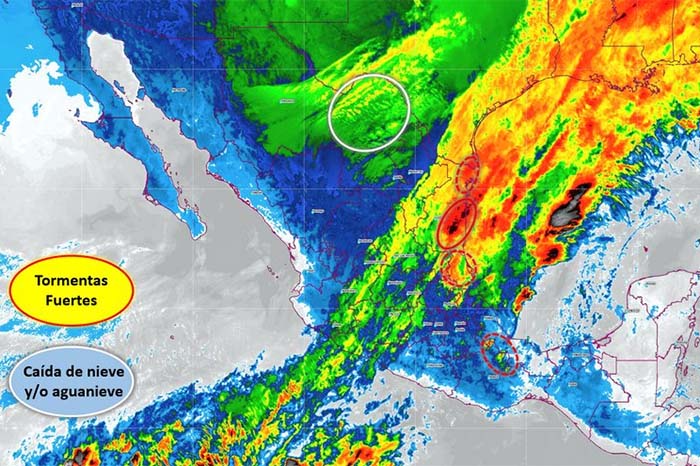 Asimismo, ocasionarán tormentas intensas a puntuales torrenciales en el oriente y sureste del país, incluyendo la Península de Yucatán, y tormentas fuertes con posible caída de granizo en el centro y sur del país.