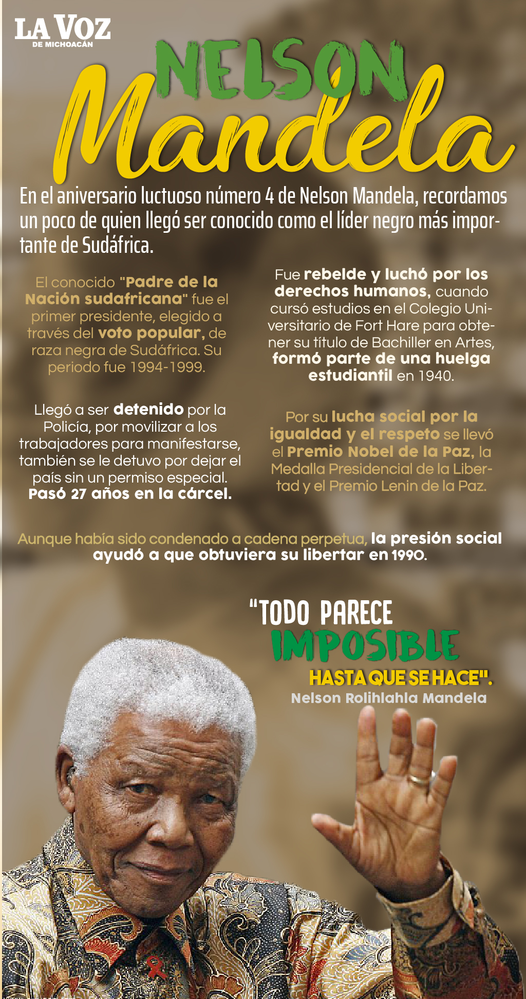 Mundo | 5 Dic, 2017, 21:47 A 4 años de su muerte, recordamos a Nelson Mandela La Voz de Michoacán. Las últimas noticias, hoy. Foto: Larissa Vieyra. - + PUBLICIDAD