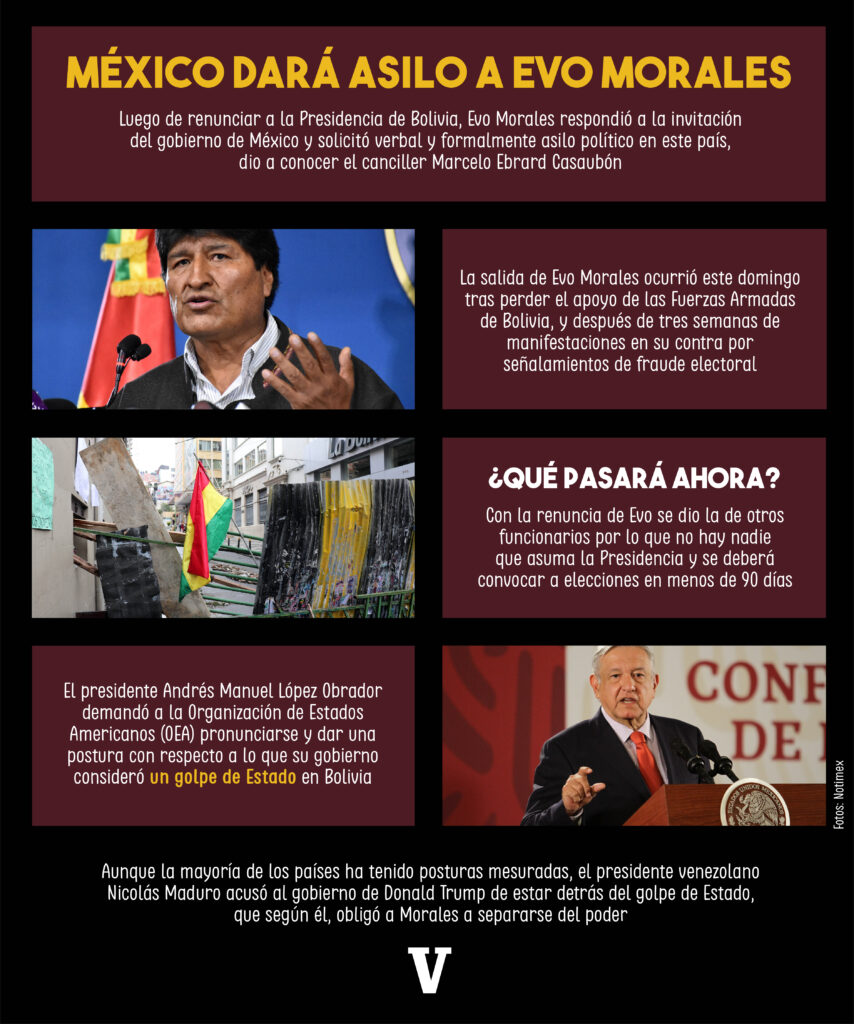 AP / La Voz de Michoacán La Paz, Bolivia. El expresidente boliviano Evo Morales informa en Twitter que deja el país y parte rumbo a México, que le concedió asilo político por “razones humanitarias”. A través de Twitter, el canciller mexicano, Marcelo Ebrard, confirmó que ya despegó el avión de la Fuerza Aérea Mexicana con el expresidente boliviano a bordo. "De acuerdo a las convenciones internacionales vigentes está bajo la protección del de México. Su vida e integridad están a salvo", señaló. https://twitter.com/evoespueblo/status/1194064700075589638 “Hermanas y hermanos, parto rumbo a México, agradecido por el desprendimiento del gobierno de ese pueblo hermano que nos brindó asilo para cuidar nuestra vida. Me duele abandonar el país por razones políticas, pero siempre estaré pendiente. Pronto volveré con más fuerza y energía”, decía el mensaje. En tanto, el Alto Mando Militar de Bolivia anunció que saldrá a patrullar a las calles en La Paz para repeler a grupos violentos que rebasaron a la policía y causan caos y vandalismo en la ciudad un día después de la renuncia del presidente Evo Morales. Esta es la primera vez, tras el inicio de las protestas desatadas por las elecciones del 20 de octubre, que las Fuerzas Armadas anuncian su respaldo en las calles. https://twitter.com/evoespueblo/status/1194059795365543936 Maduro ve mano de EUA El presidente venezolano Nicolás Maduro acusa al gobierno de Donald Trump de estar detrás del golpe de Estado, que según él, obligó a Morales a separarse del poder. “Nosotros lo denunciamos. El golpe de Estado contra Evo Morales en Bolivia lo dieron, financiado y dirigido desde la Casa Blanca, como se han dado todos los golpes de Estado en América Latina y el Caribe en estos últimos 100 años”, dijo el mandatario en Caracas acompañado de sus ministros y los alcaldes y gobernadores oficialistas, reunidos en el palacio de gobierno. Trump “dio la orden de derrocar al indio, de acabar con el indio”, afirmó. “Esta emboscada que se montó contra Evo Morales se montó desde el imperialismo norteamericano y hoy sacan la cara a aplaudir y a decir que ahora vienen por Venezuela y Nicaragua. ¡Alerta pueblo!”, insistió el gobernante venezolano, citando el comunicado difundido horas antes por la Casa Blanca en Washington. Infografía web “¿Quieren pelea? Vamos a dar la pelea por la paz, por la patria, por la soberanía y por la revolución bolivariana de Venezuela”, agregó. En tanto, el secretario de Relaciones Exteriores de México ha dicho que Morales solicitó asilo en México a través de una llamada telefónica la tarde del lunes y que la Secretaría de Gobernación se lo otorgó. En Estados Unidos, el senador Bernie Sanders se dijo preocupado acerca de la participación de las fuerzas armadas bolivianas en la renuncia del presidente Evo Morales. El mandatario renunció el domingo después de que el jefe máximo de las fuerzas armadas lo exhortó a que lo hiciera tras semanas de protestas en torno a su controversial victoria en los comicios presidenciales del 20 de octubre. El general habló unas horas después de que la Organización de los Estados Americanos diera a conocer una auditoria en la que reportó irregularidades en el conteo de votos. “Me preocupa mucho lo que parece ser un golpe de Estado en Bolivia, donde las fuerzas armadas, tras semanas de agitación política, intervinieron para quitar al presidente Evo Morales”, afirmó Sanders el lunes en Twitter. El aspirante a la nominación del Partido Demócrata a la presidencia dijo también que “Estados Unidos debe exhortar a que se acabe la violencia y respaldar las instituciones democráticas de Bolivia”. Por su parte, la Organización de Estados Americanos (OEA) anunció que celebrará el martes una sesión extraordinaria para analizar la situación en Bolivia, que vive un vacío de poder tras la renuncia del presidente Evo Morales a su cargo. El organismo informó en un comunicado que la reunión se realizará a petición de las misiones de Brasil, Canadá, Colombia, Estados Unidos, Guatemala, Perú, República Dominicana y Venezuela. En la sesión se presentará también el análisis sobre las elecciones presidenciales del 20 de octubre. En un reporte preliminar, la misma OEA advirtió el domingo que se presentaron diversas irregularidades. Morales se declaró vencedor de las elecciones en medio de señalamientos de la oposición de que se había cometido un fraude electoral. Oposición llamará a elecciones La senadora opositora Jeanine Añez llega a la Asamblea Legislativa el lunes e informa que asumirá la presidencia del Senado y se compromete luego a llamar a elecciones. Una vez asumida la presidencia del Senado, Añez queda en la cadena de sucesión constitucional a la presidencia después de la renuncia de su colega Adriana Salvatierra, quien dimitió la víspera. “Es de manera constitucional. Voy a sumir primeramente la presidencia del Senado”, dice Añez al pedir el cese de la violencia en medio de lágrimas. “Hemos venido a trabajar... necesitamos el apoyo de todos los movimientos. Todos somos bolivianos”. Asegura que busca dar seguridad a todos sus colegas para que lleguen a sesionar por la tarde y dice que tiene la esperanza de convocar a elecciones.