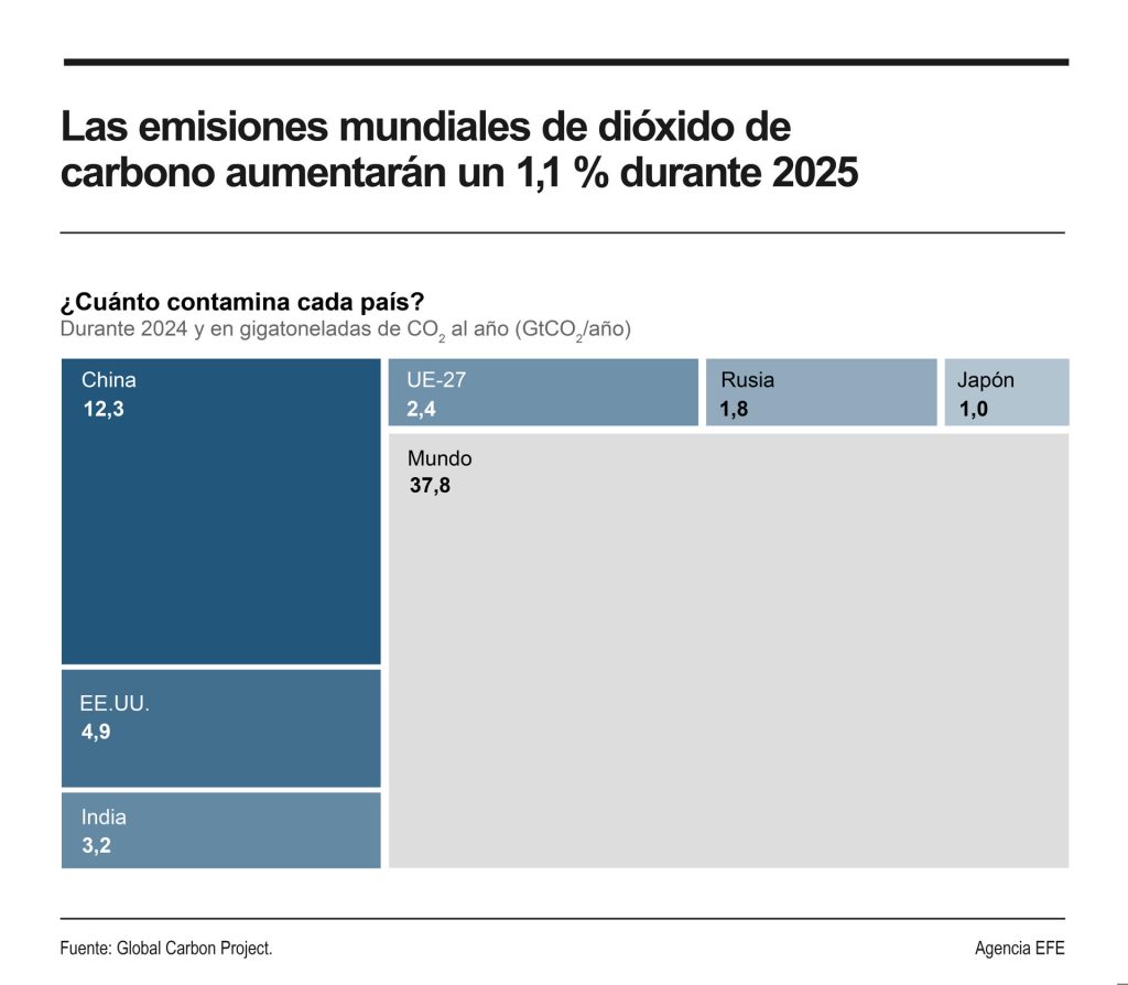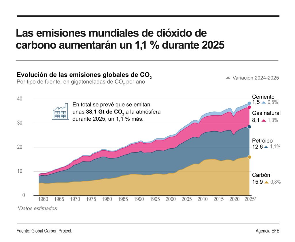Nuevo récord de emisiones de CO2 de origen fósil en 2025 tras aumentar un 1.1 %
